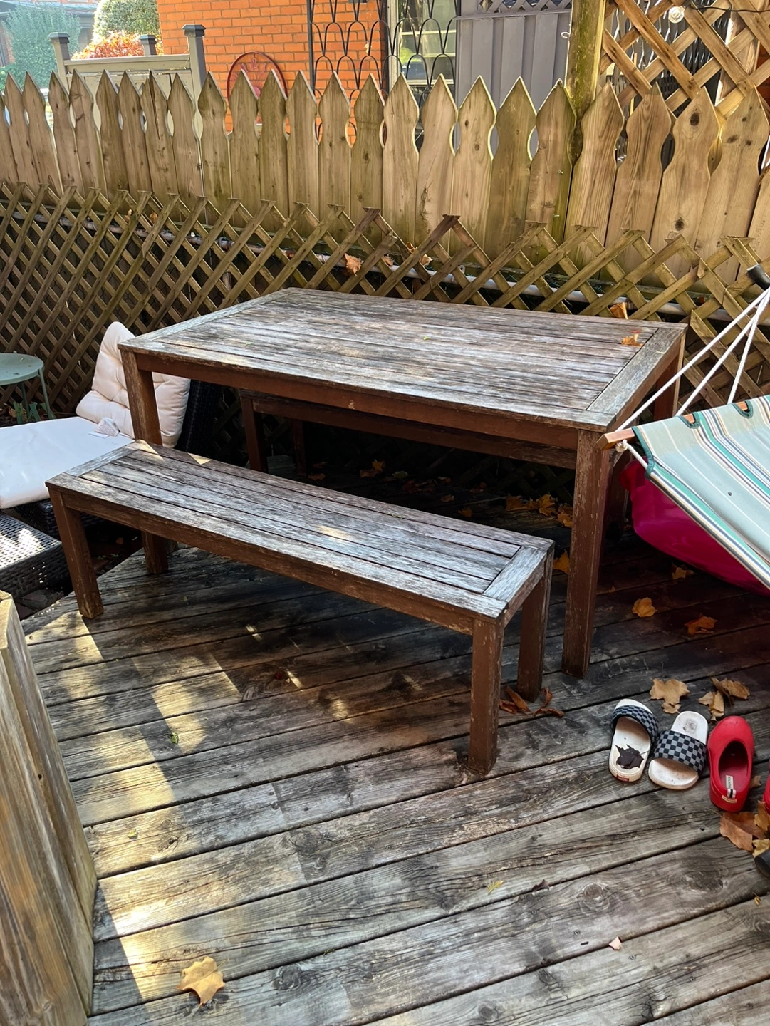 15Free weathered wooden patio table and two benches. Shows signs of age and use. Perfect for a rustic outdoor space. Black cushions for benches included. Moving and need it gone by tonight! Pick up near queen and herkimer