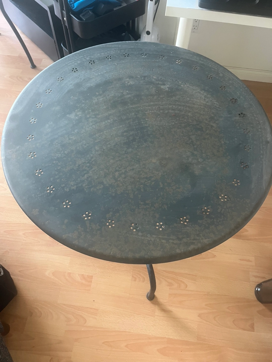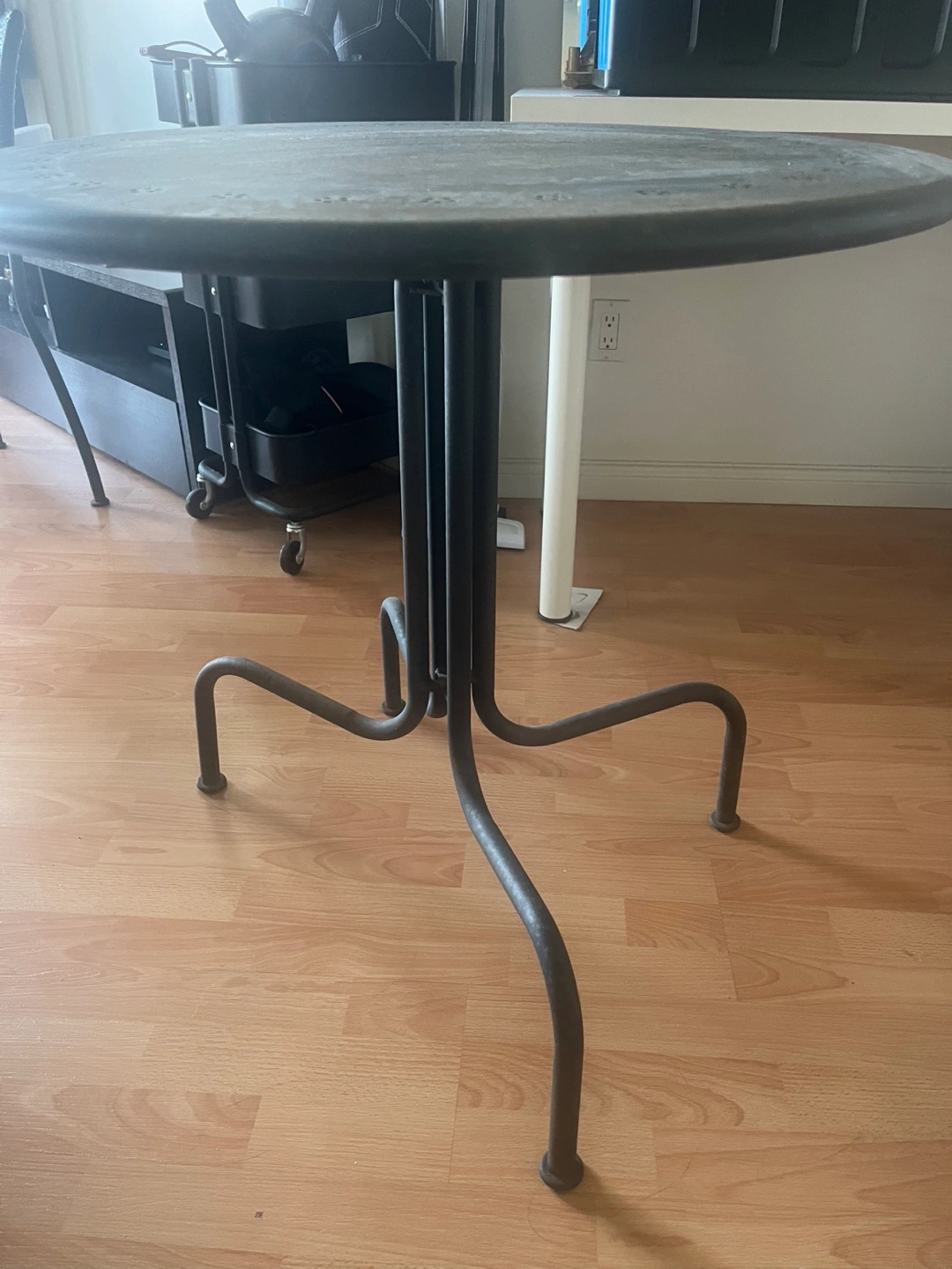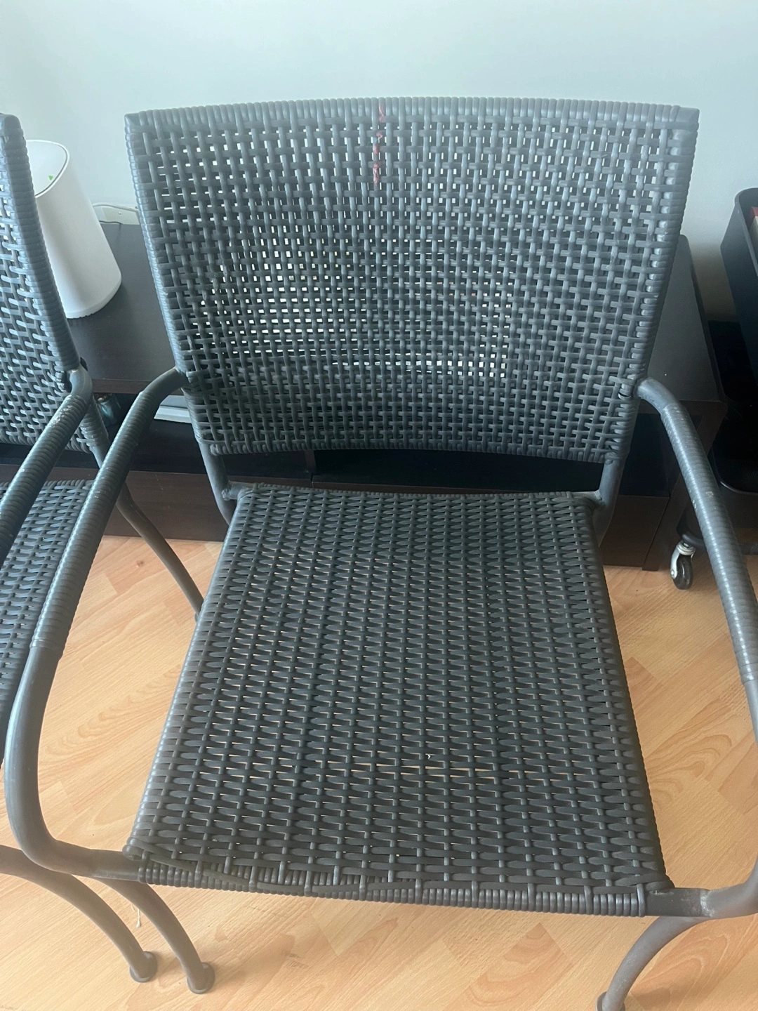 Selling a patio table with two matching chairs. The set is perfect for a small outdoor space like a balcony or small patio. The chairs are made of a woven material and have a comfortable armrest height. Just needs a little TLC.