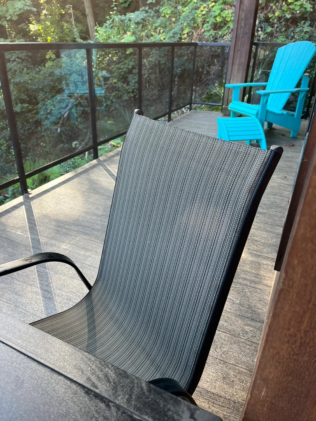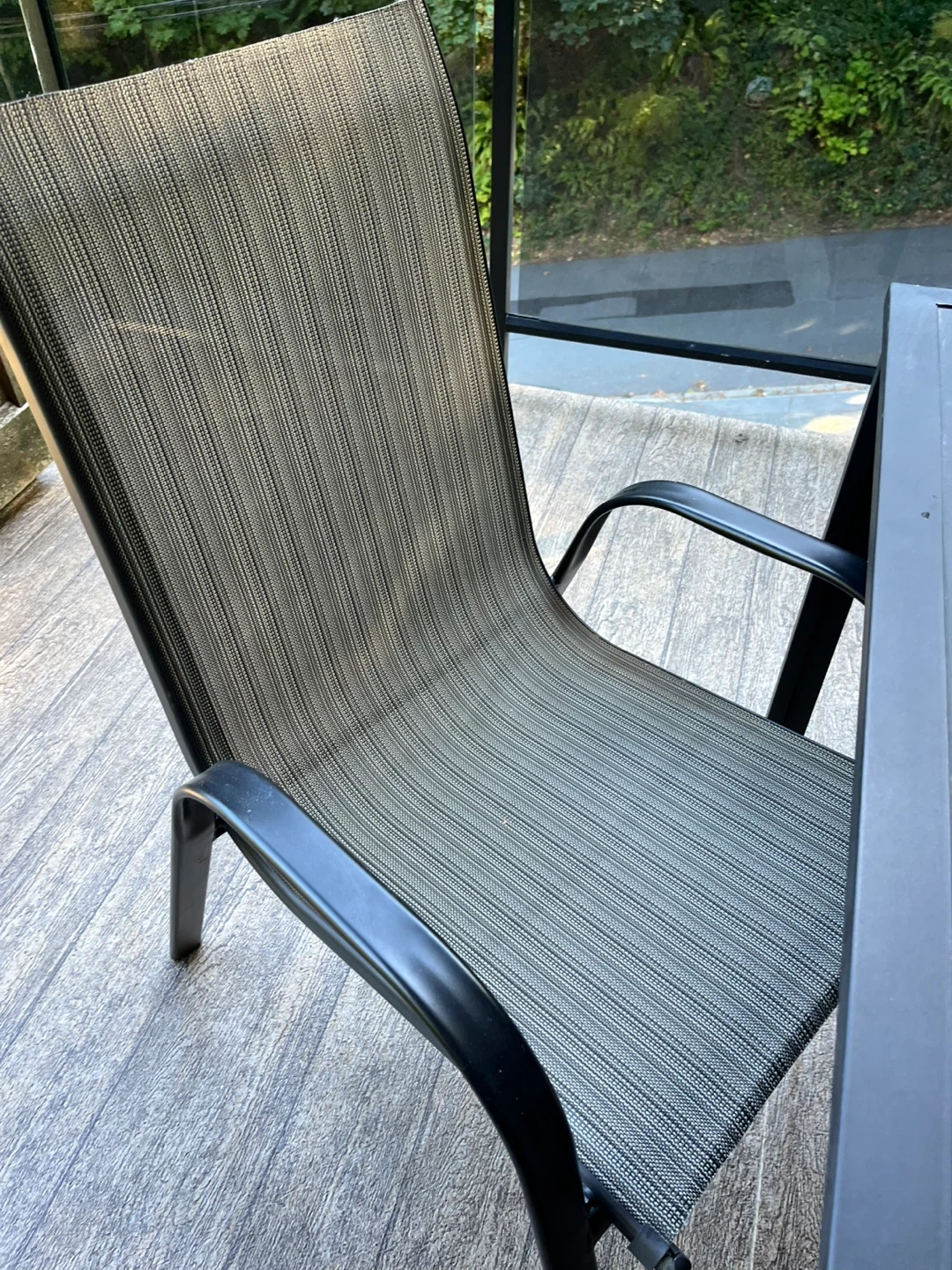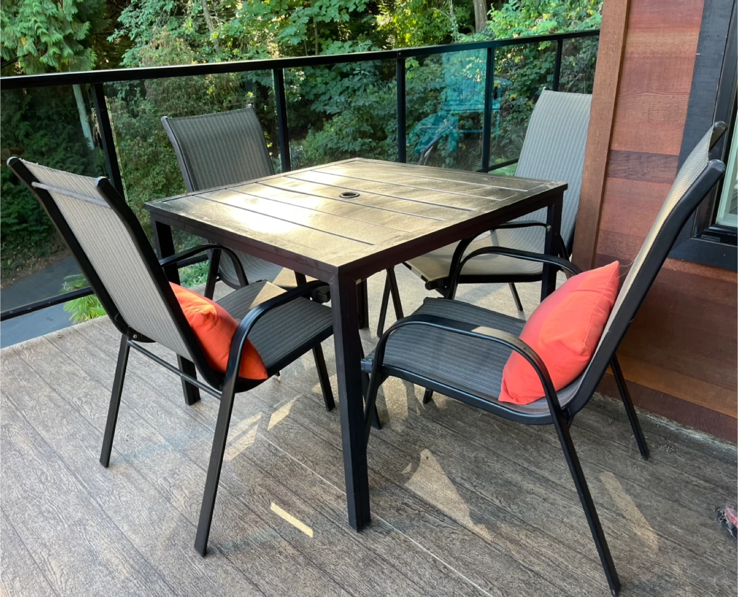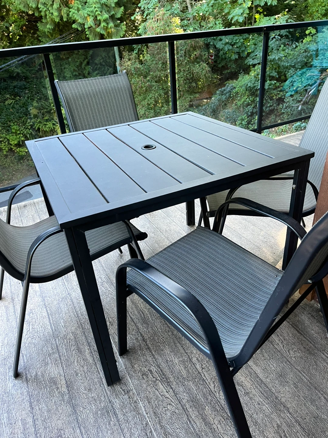 Selling a patio table with four chairs. Great for enjoying the outdoors. The chairs are a neutral gray colour with black frames. The table is also black. Perfect for a balcony or small patio space! Hole for umbrella Some rust but still lots of life and sturdy