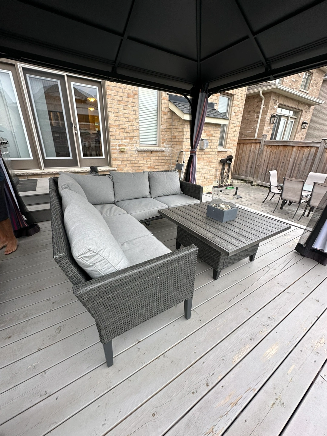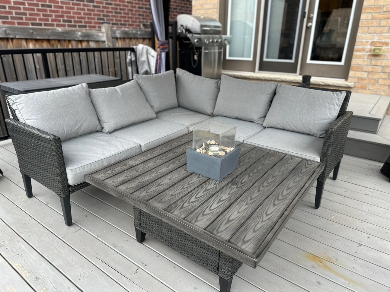 This sectional sofa is in great condition. The cushions are removable and machine washable. The coffee table has a grey washed wood top and can be converted to a dining table to eat meals outdoors on. This combo is perfect for relaxing on a warm summer day.