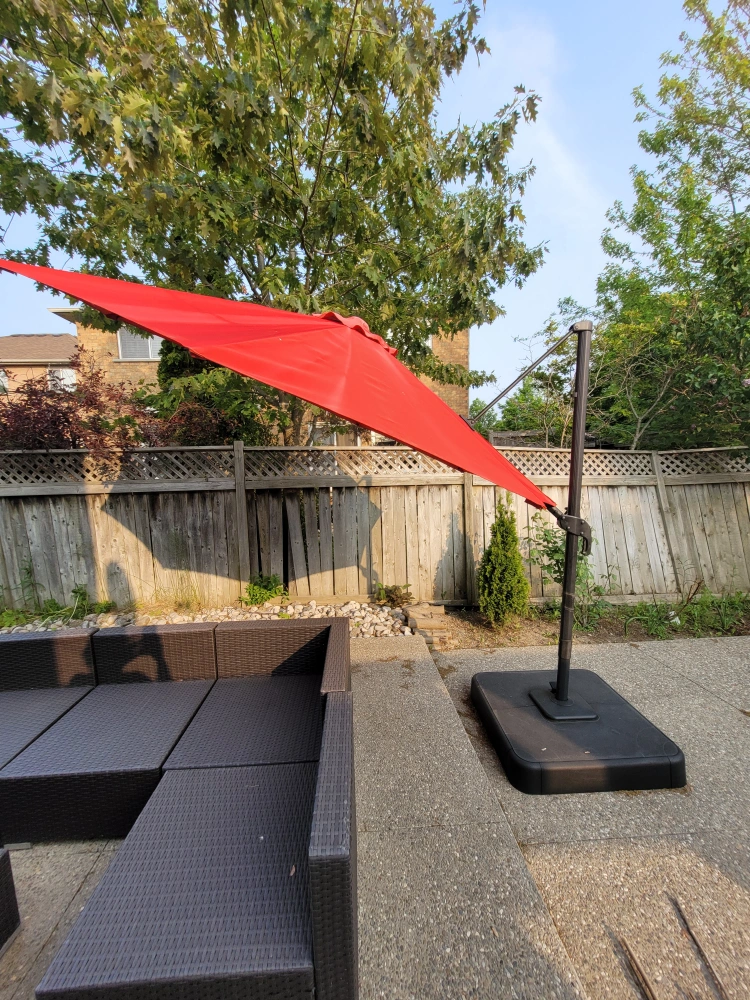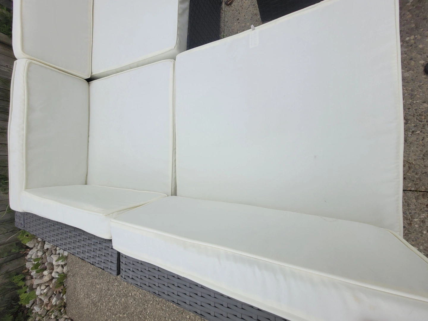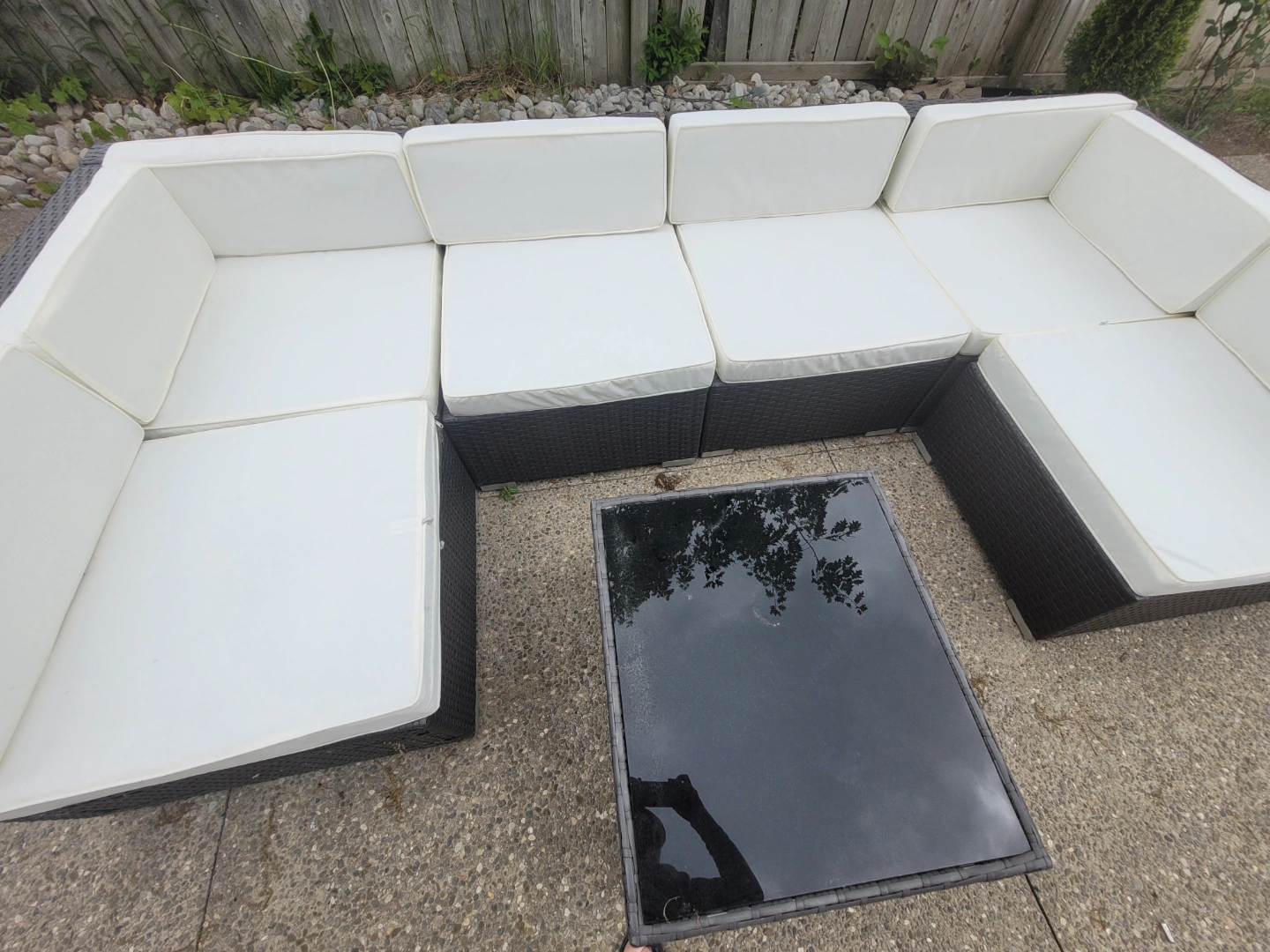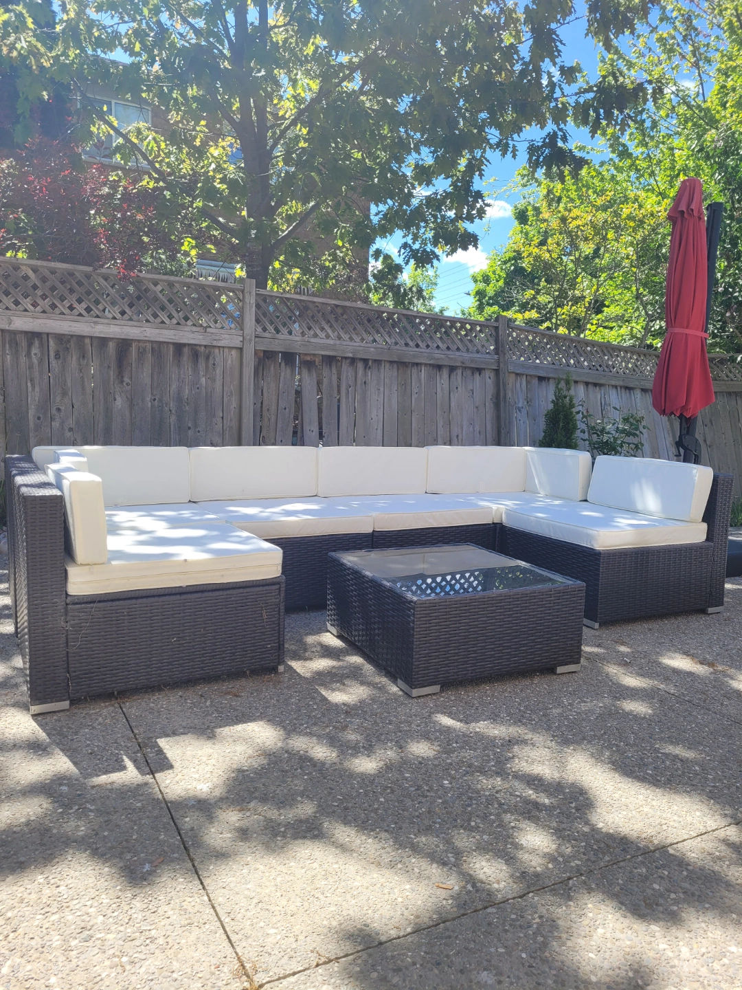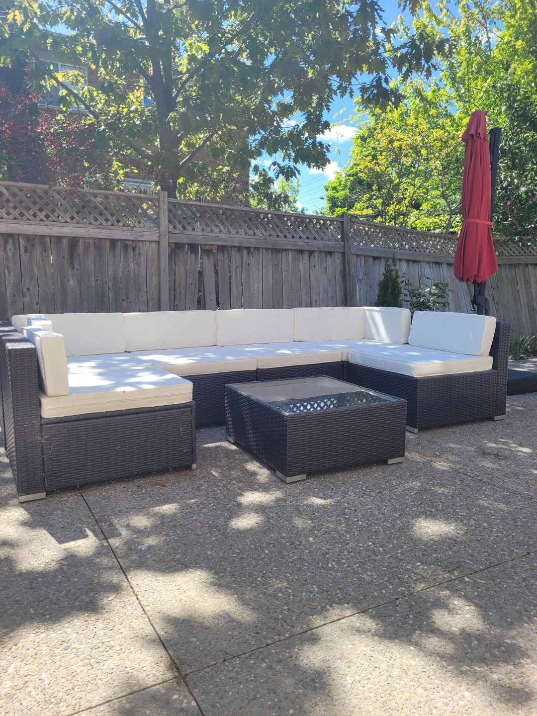 15Sectional sofa with cushions. Included is a matching coffee table. Imagine yourself reading a book on this set, enjoying the beautiful weather. 7 pieces patio set and umbrella original price is 1100$ umbrella original price 200$ 600$ for the set 100$ for the umbrella together 650