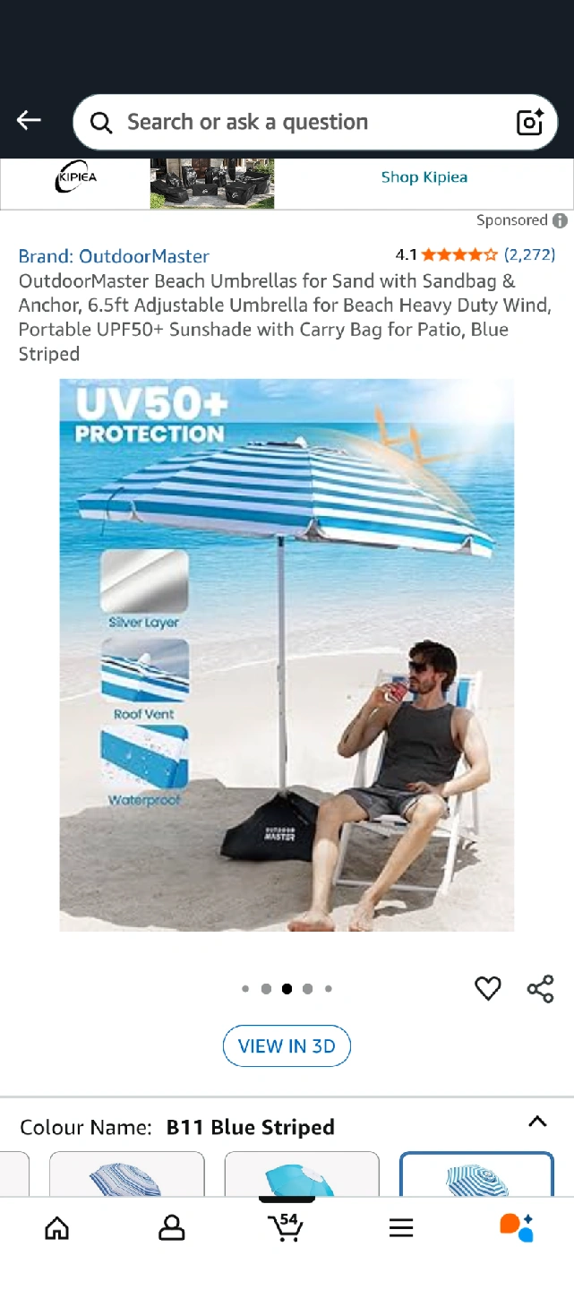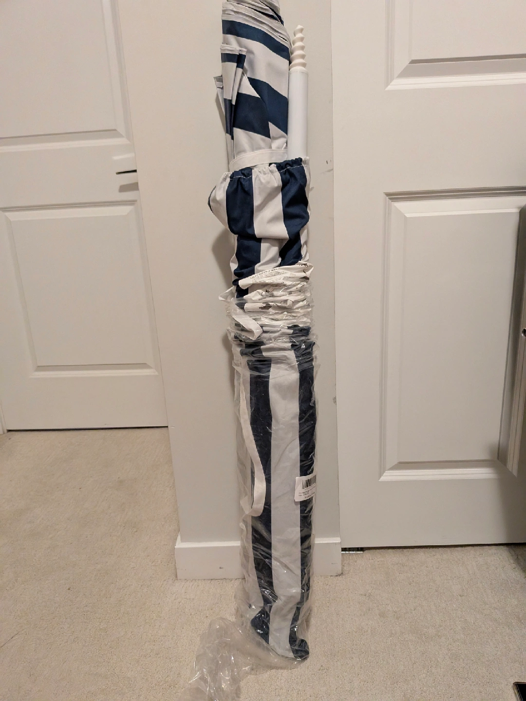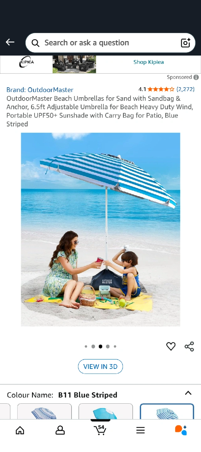 OutdoorMaster beach umbrella in a blue striped pattern. It's 6.5ft adjustable and comes with a sandbag and anchor. It also has UV50+ sunshade and a carry bag for easy transport to the patio or beach! Stable & Safe with excellent wind resistance.