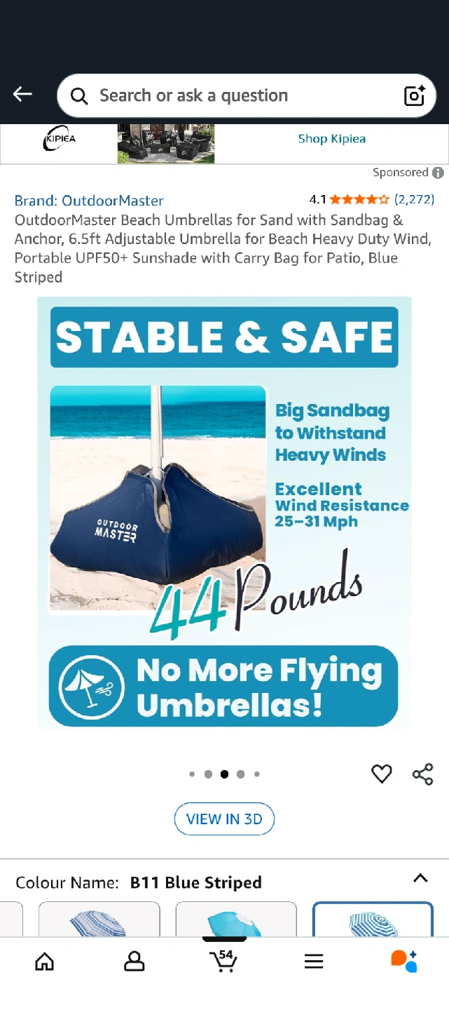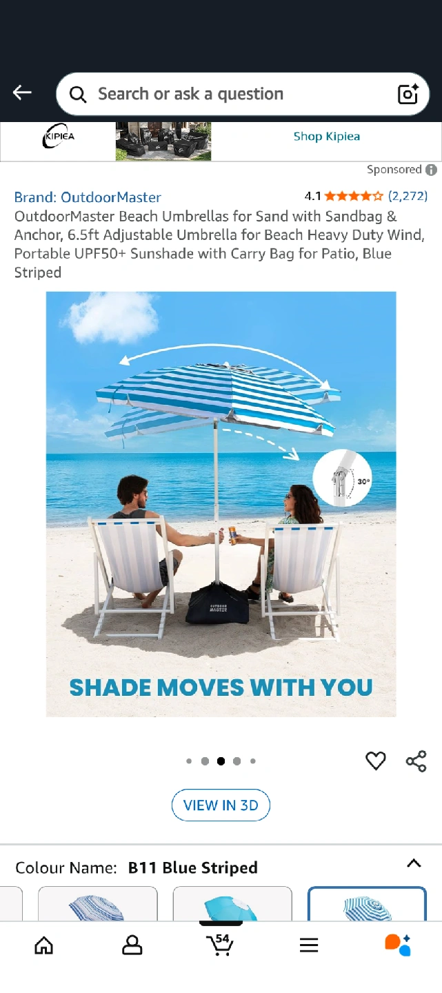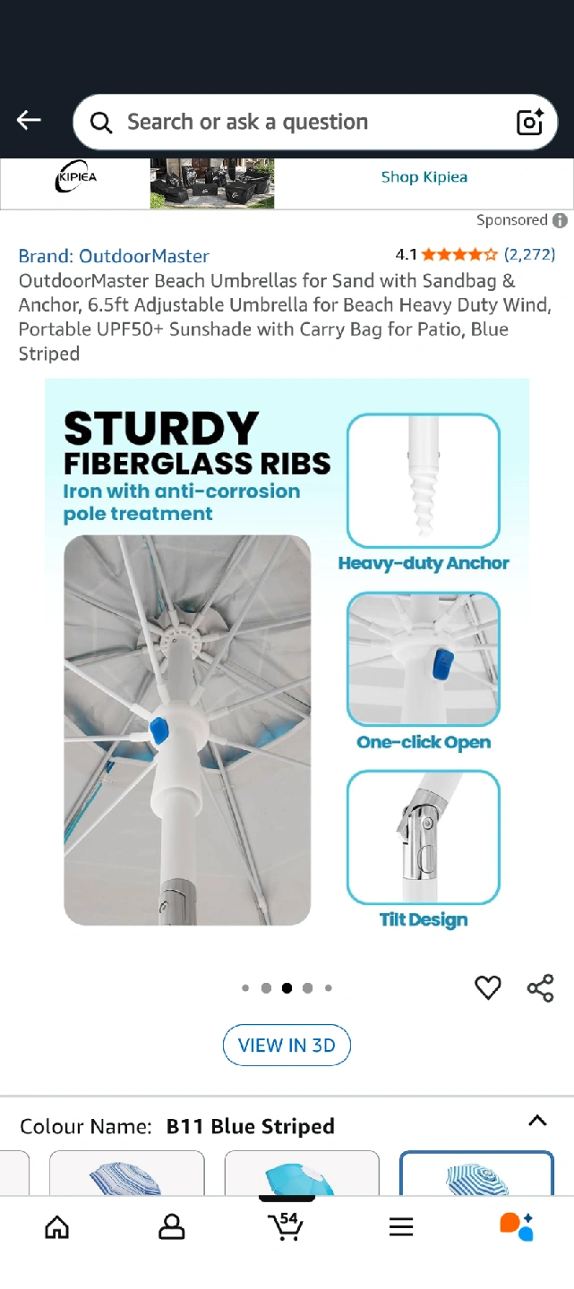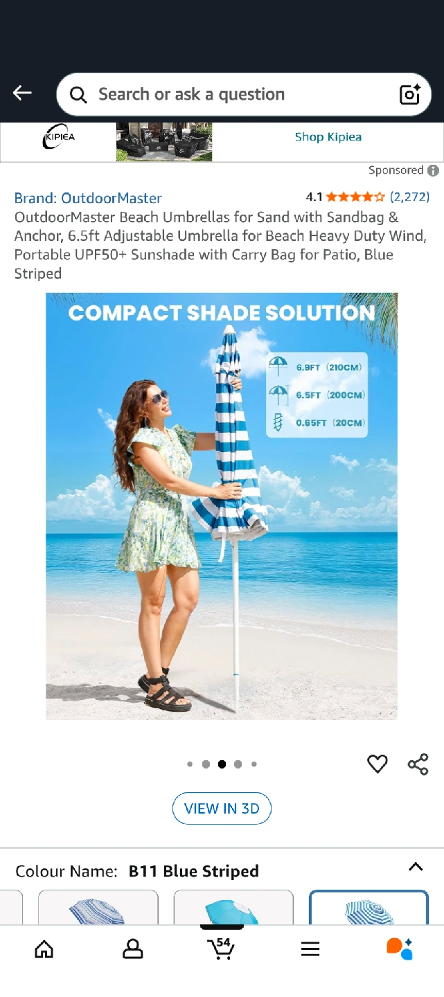 OutdoorMaster beach umbrella in a blue striped pattern. It's 6.5ft adjustable and comes with a sandbag and anchor. It also has UV50+ sunshade and a carry bag for easy transport to the patio or beach! Stable & Safe with excellent wind resistance.