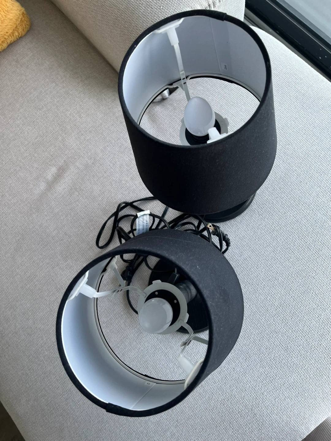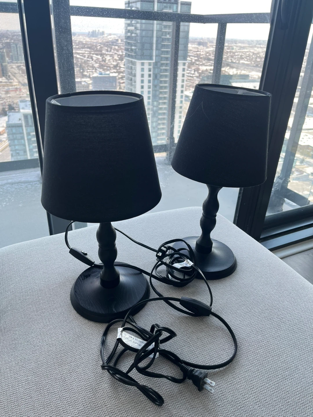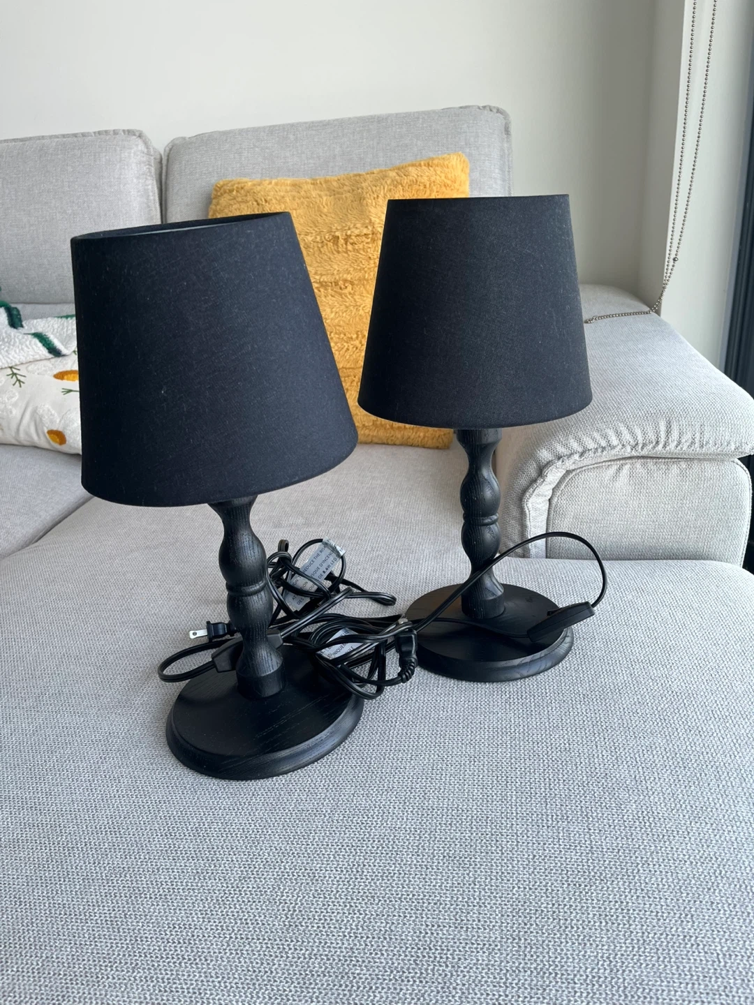 Selling a set of two black table lamps. They have a classic design that would look great in any room. They are in good condition and ready to brighten up your space!