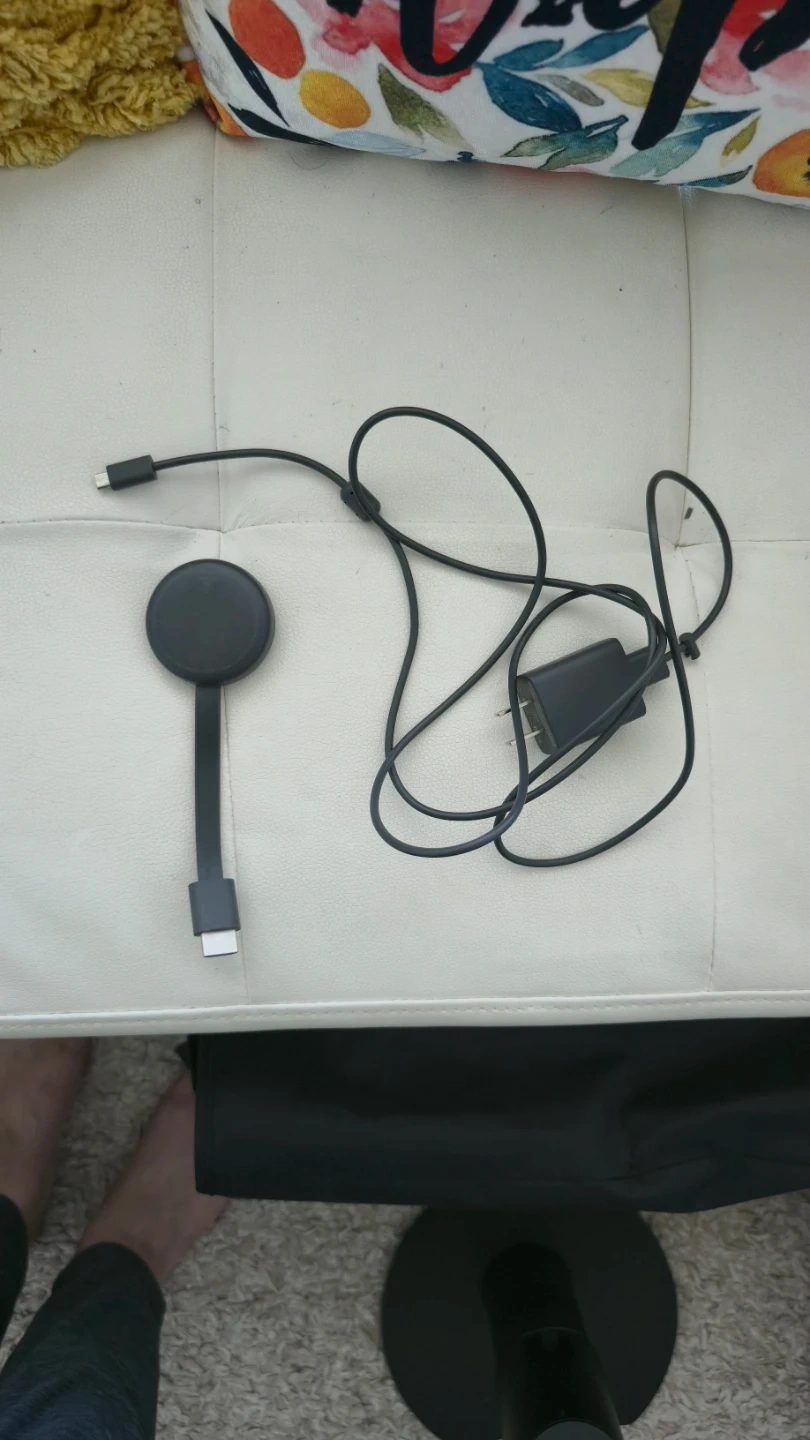 This is a 1st generation Google Chromecast for streaming content to your TV. It's a black, round device that connects via HDMI. Includes the power adapter and cable.