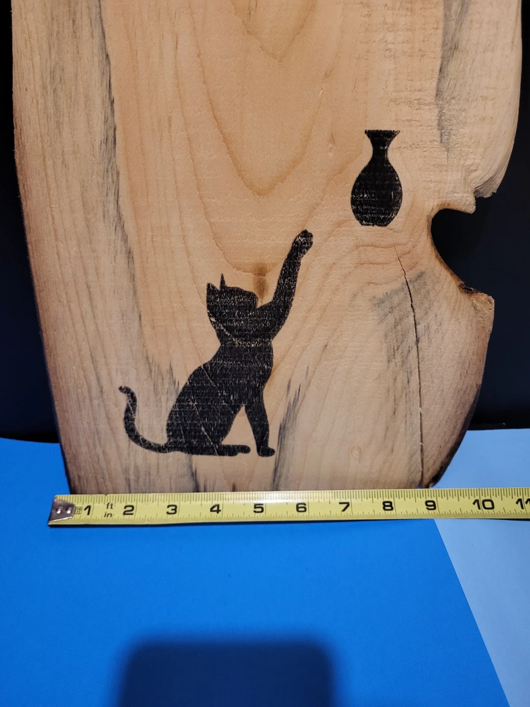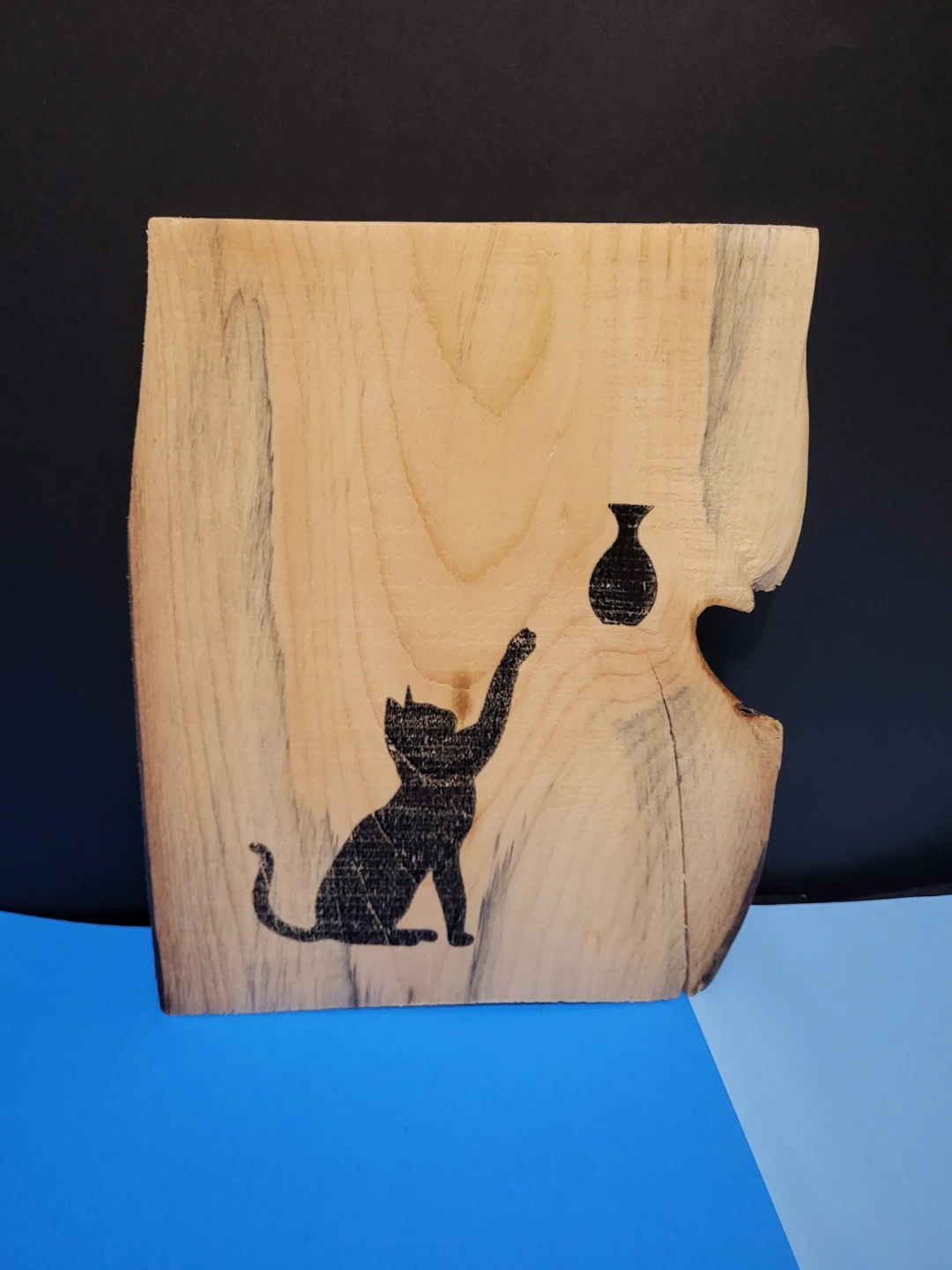 Wooden decor piece featuring a black silhouette of a cat reaching for a vase. It's made from light-coloured pine wood with a natural edge.