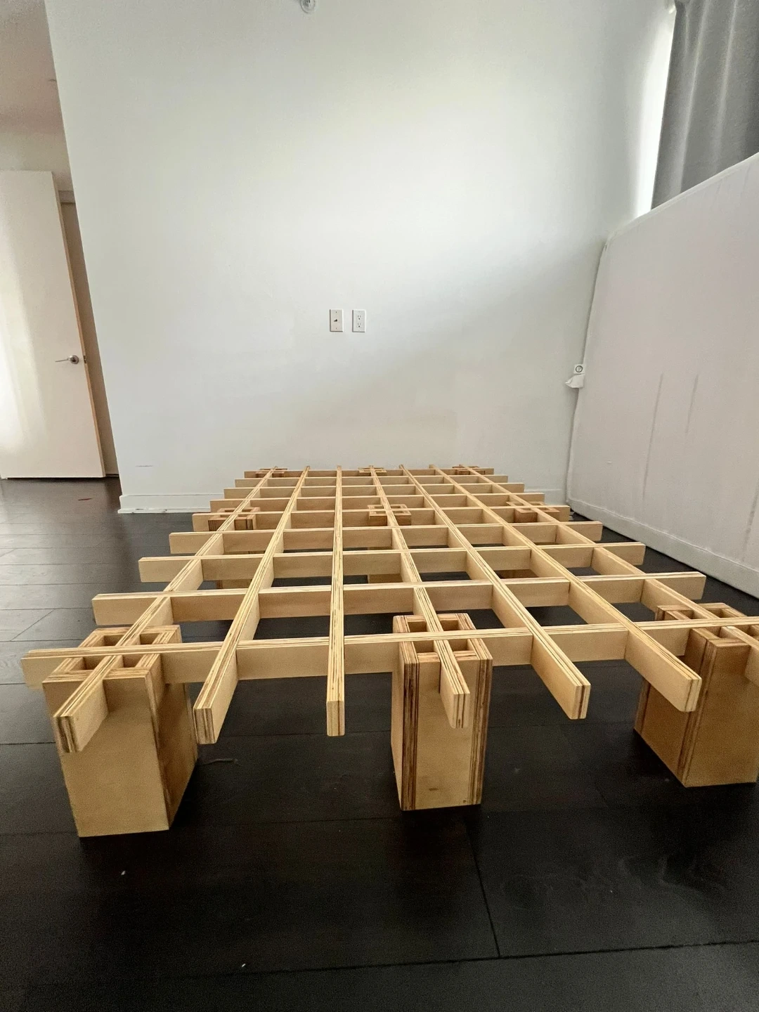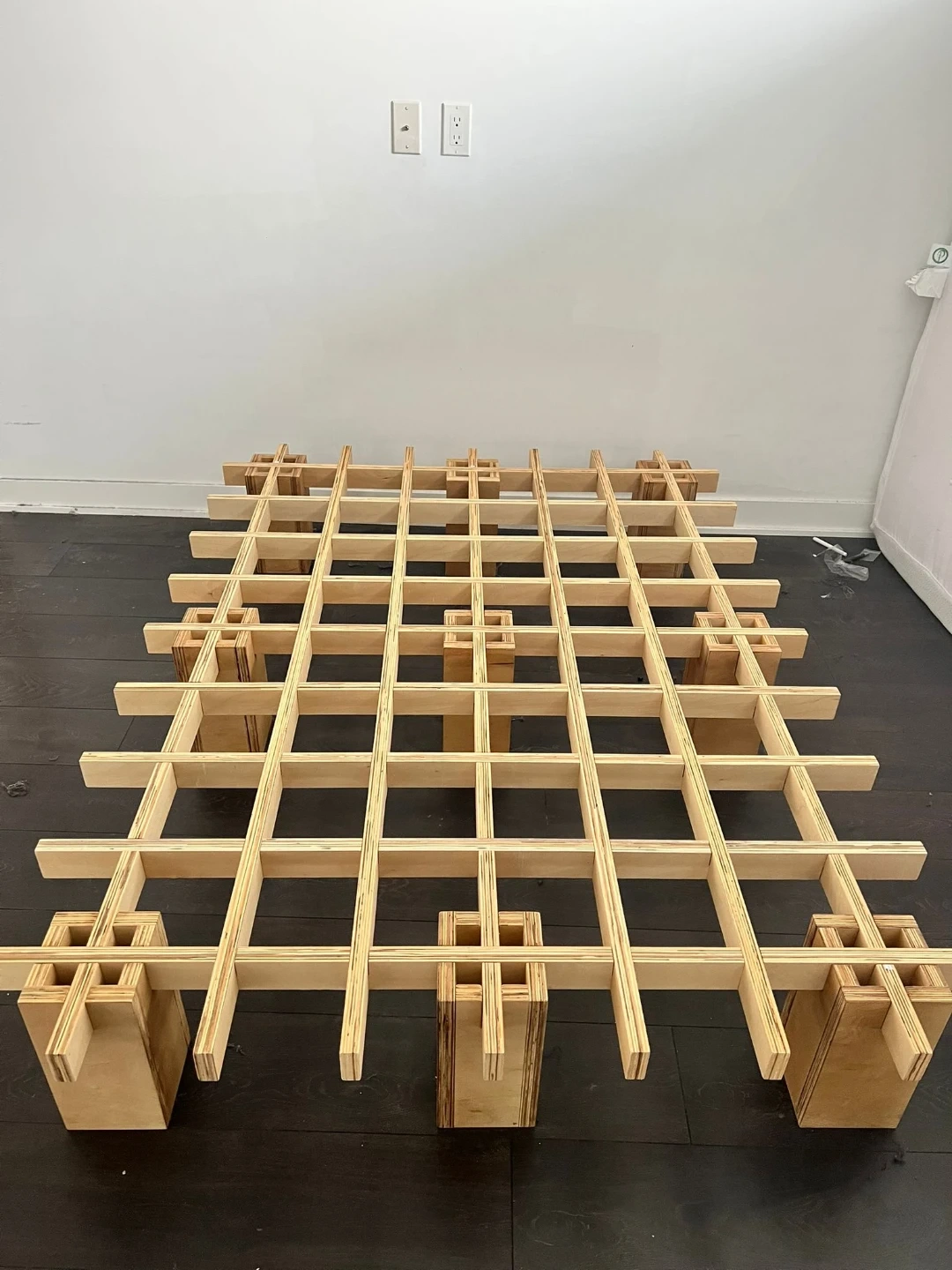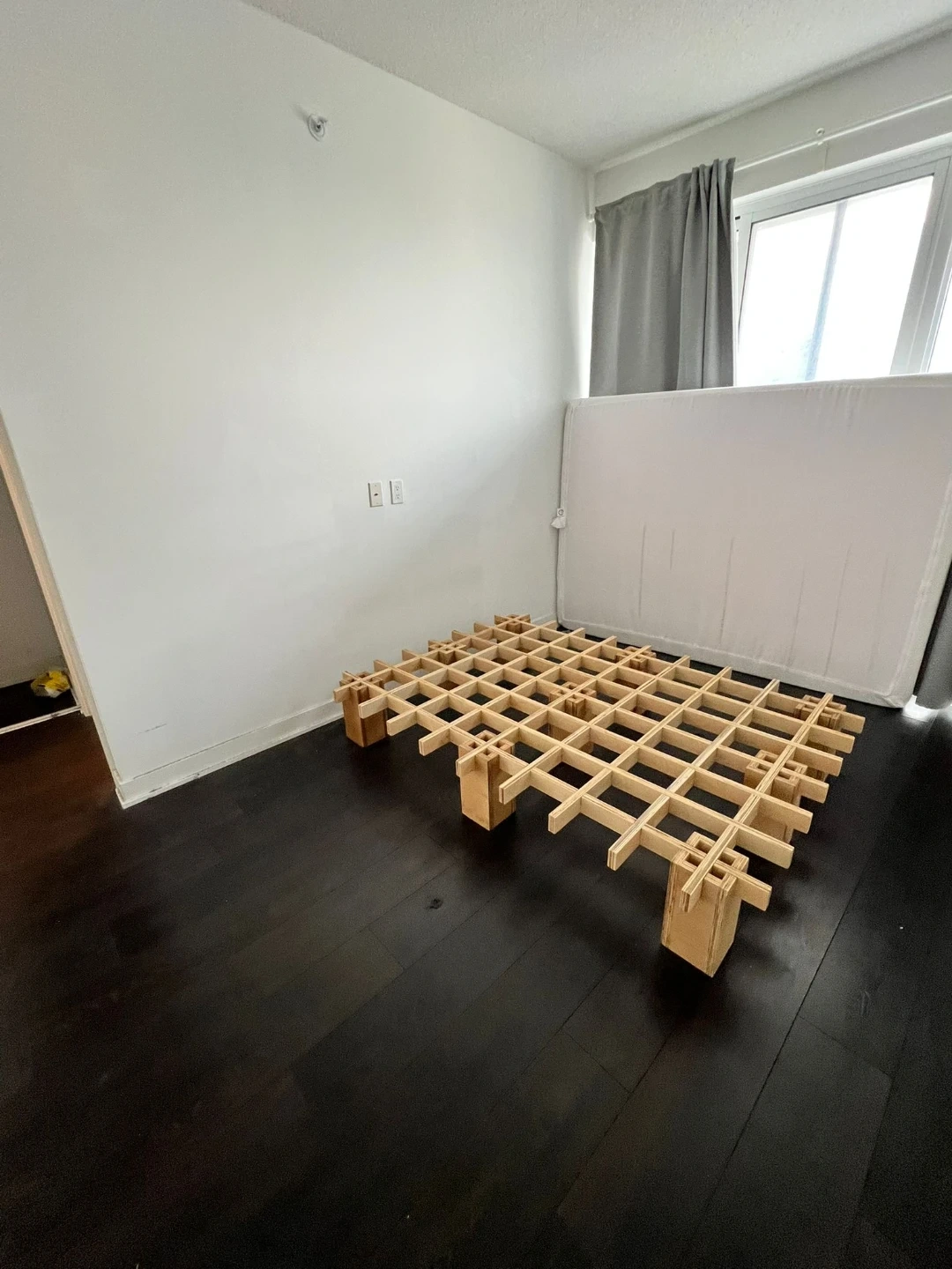 Queen size wooden bed frame platform. Birch plywood construction with a modular design. Provides sturdy mattress support. Extremely easy to assemble and disassemble (like a Lego!). Must be picked up by end of April from King West.