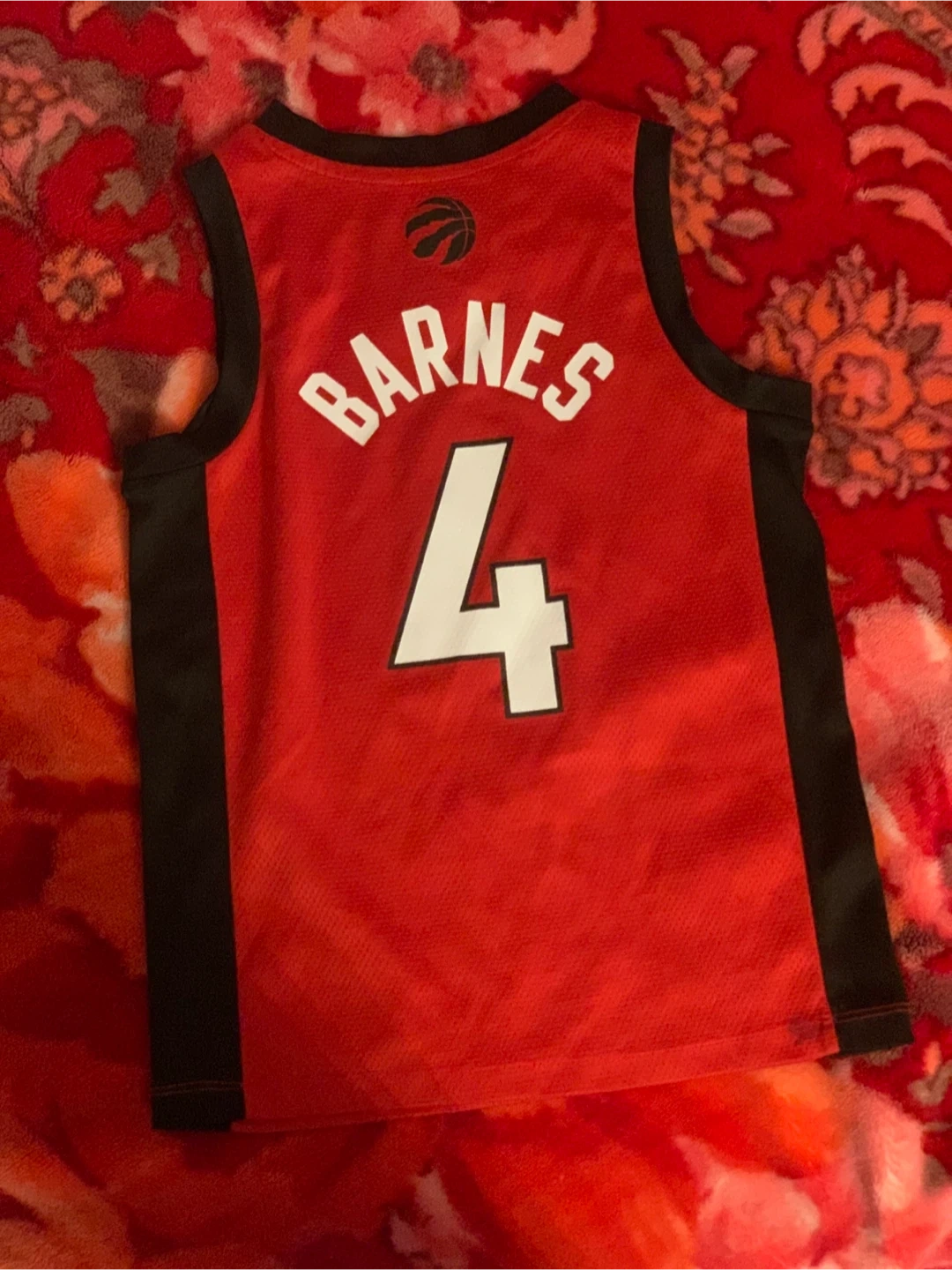 This is a Toronto Raptors jersey featuring Scottie Barnes and the number 4. It's red with black accents and the NBA logo is visible. Perfect for any young Raptors fan!