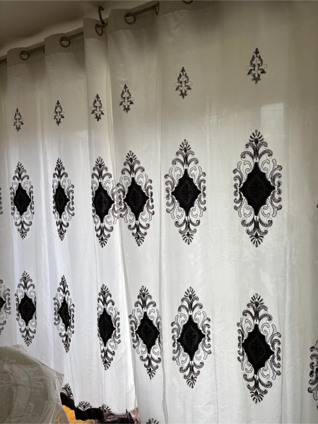 Sheer curtains with an elegant damask pattern. They're great for adding a touch of style to any room. Light filters through beautifully.