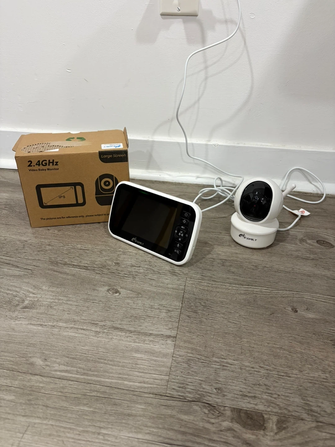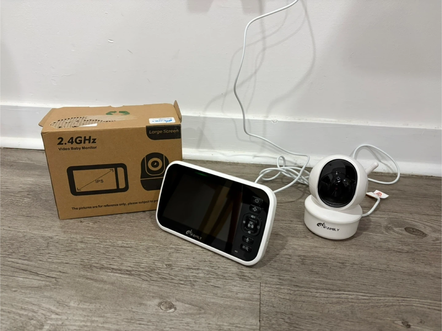 This is a 2.4GHz video baby monitor system. It includes a camera and a large screen display. The system is designed for monitoring a baby.
