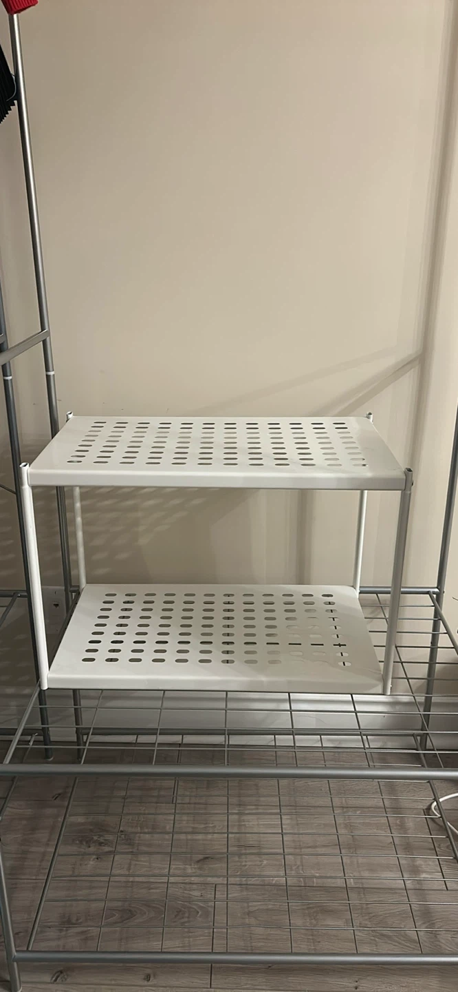 This is a two-tier white shelf unit. It's made of metal and has a perforated design. These shelves would work well for storage or organization.