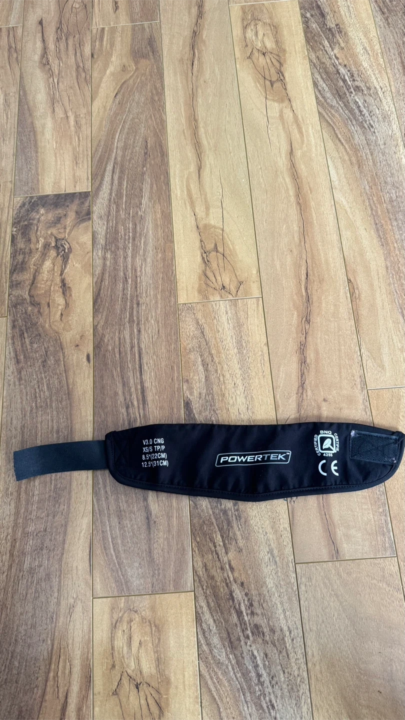 This is a Powertek V3.0 CNG hockey neck guard for kids. It's made of black fabric with adjustable Velcro. Sized from 8.5" to 12.5".