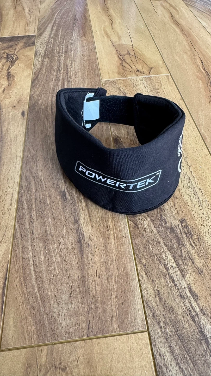 This is a Powertek V3.0 CNG hockey neck guard for kids. It's made of black fabric with adjustable Velcro. Sized from 8.5" to 12.5".