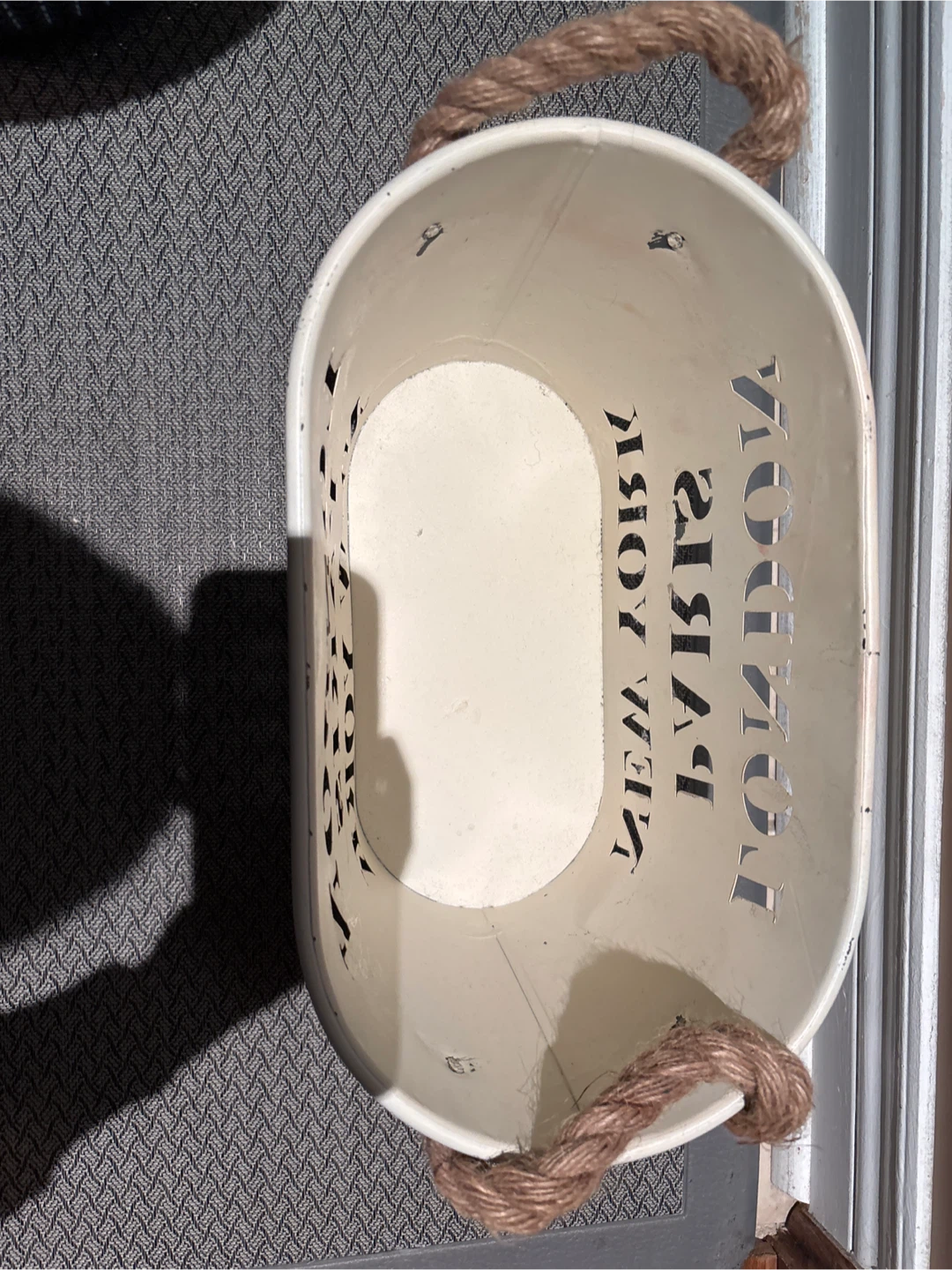 Here's a cute decorative metal bucket. It has rope handles and the words London, Paris, and New York cut out around the sides