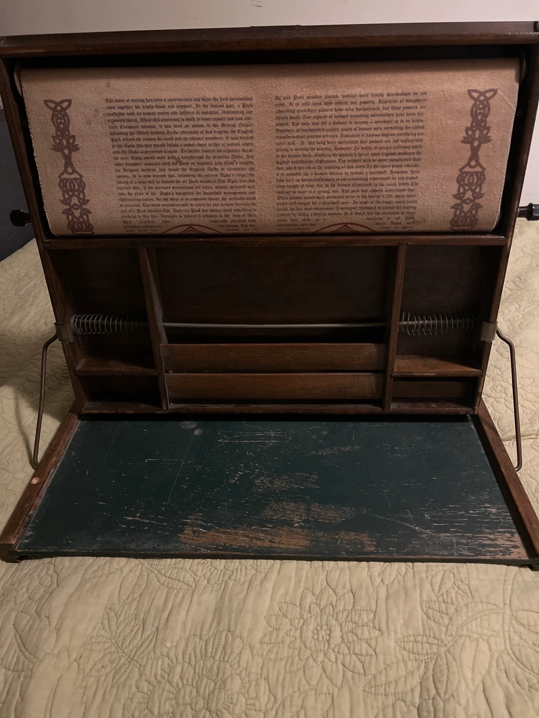 Antique child school desk with a pull-down map, scroll story, and chalkboard. Map features American resources.