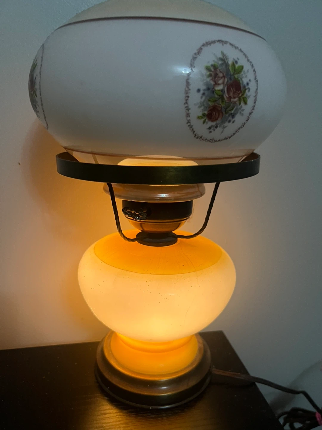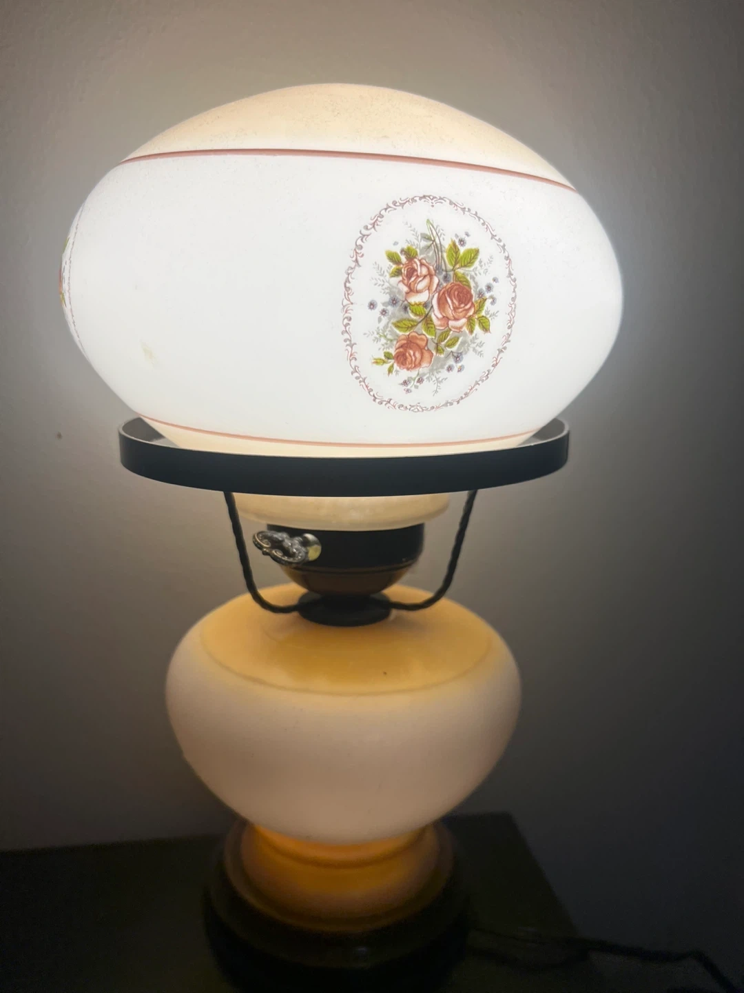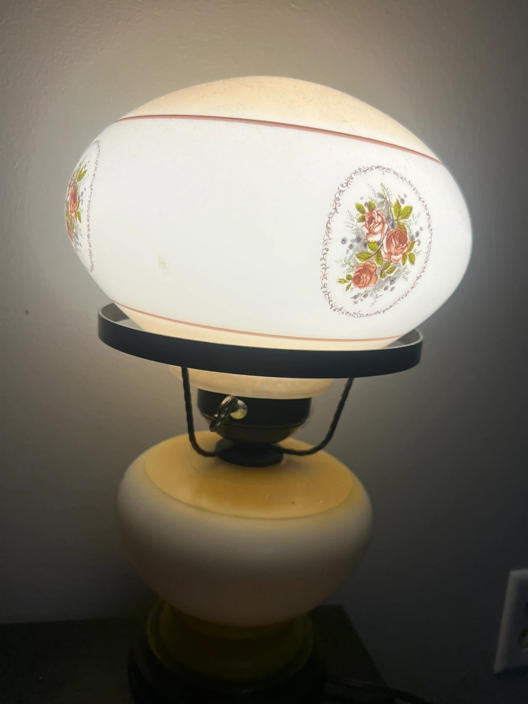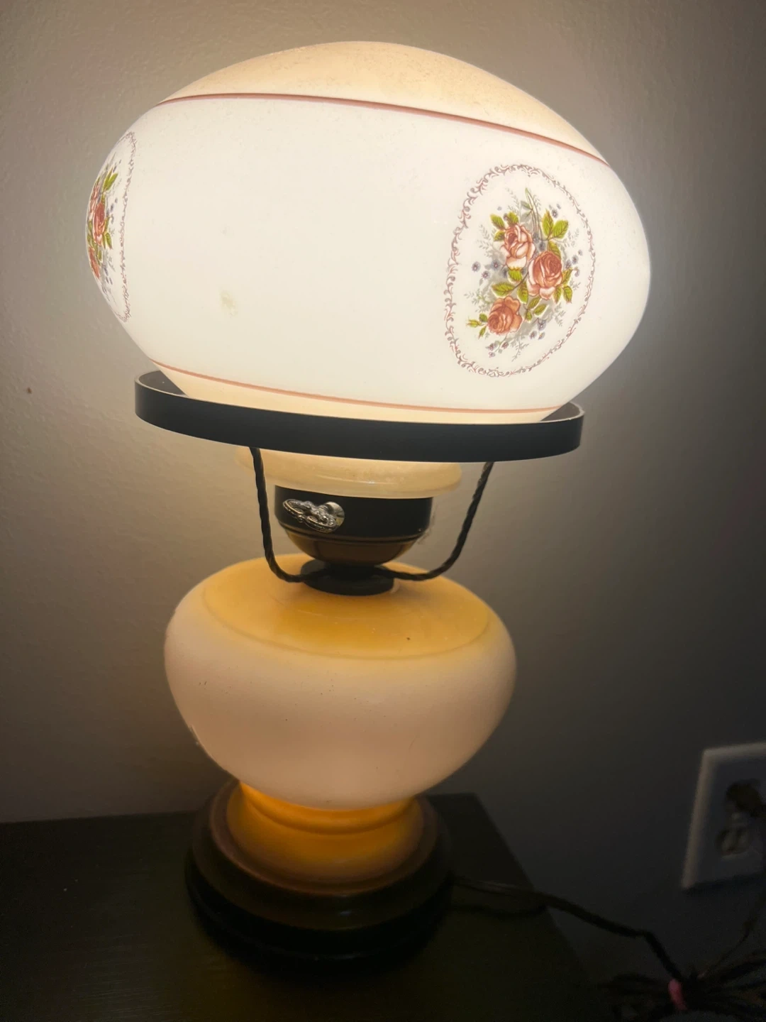 Retro table lamp with a frosted glass shade featuring a delicate rose floral pattern. It has a tiered base with a yellowish hue and a dark wood accent. It's perfect for adding a cozy, vintage touch to any room.