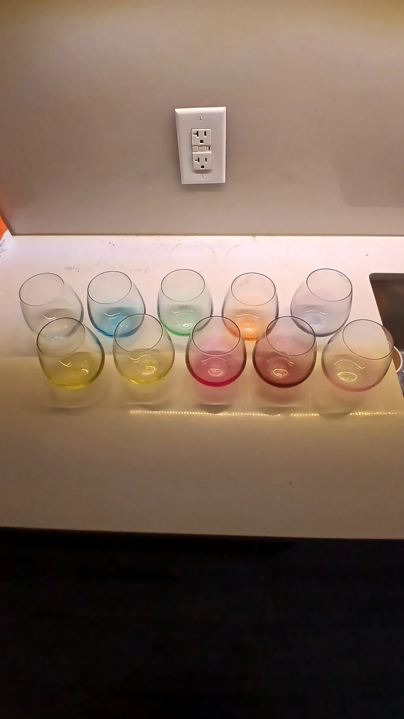 This is a set of ten stemless wine glasses. They are coloured with a gradient effect, featuring hues of yellow, blue, pink, and orange. The glasses are made of glass.