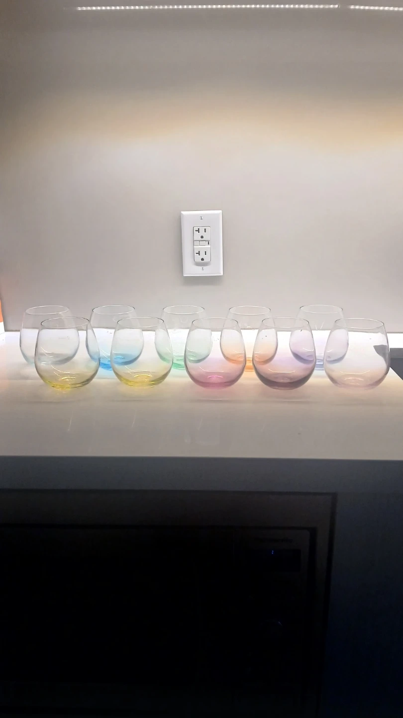 This is a set of ten stemless wine glasses. They are coloured with a gradient effect, featuring hues of yellow, blue, pink, and orange. The glasses are made of glass.