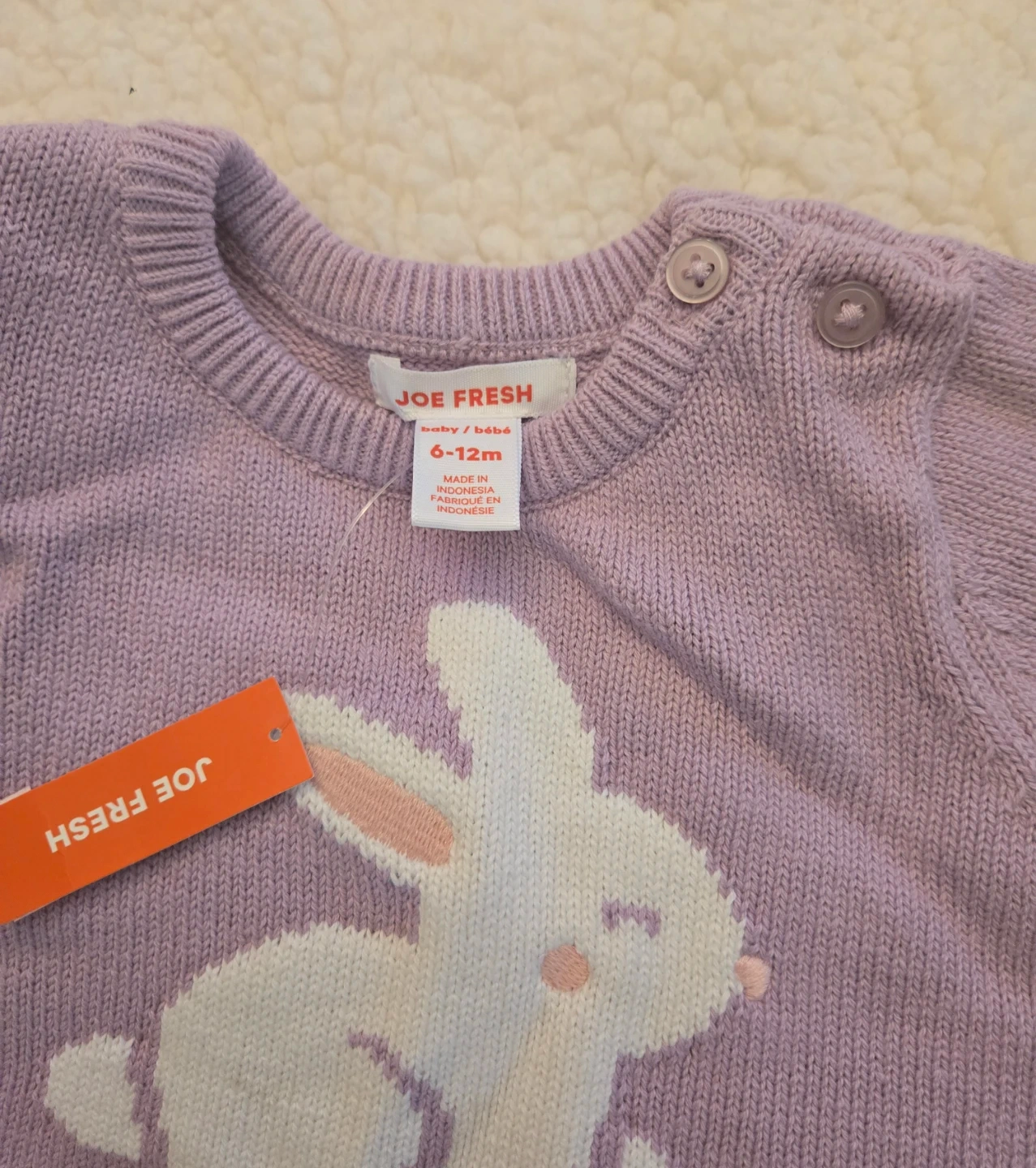 This adorable Joe Fresh baby sweater dress features a cute bunny knit. It's sized for 6-12 months. The top is a light lavender knit, and the bottom is a blue denim-style skirt. Buttons at the shoulder for easy dressing!