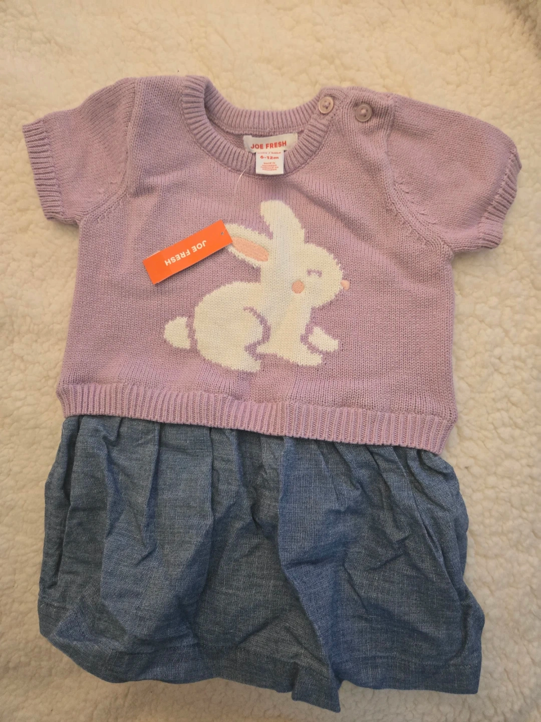 This adorable Joe Fresh baby sweater dress features a cute bunny knit. It's sized for 6-12 months. The top is a light lavender knit, and the bottom is a blue denim-style skirt. Buttons at the shoulder for easy dressing!