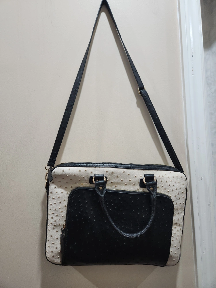 Beautiful off-white and black briefcase. Features an ostrich-print design and detachable shoulder strap. Gold-tone hardware. Zip closure. Great for work or travel.