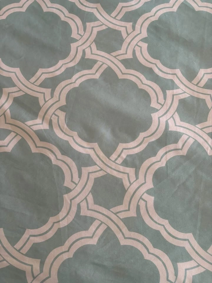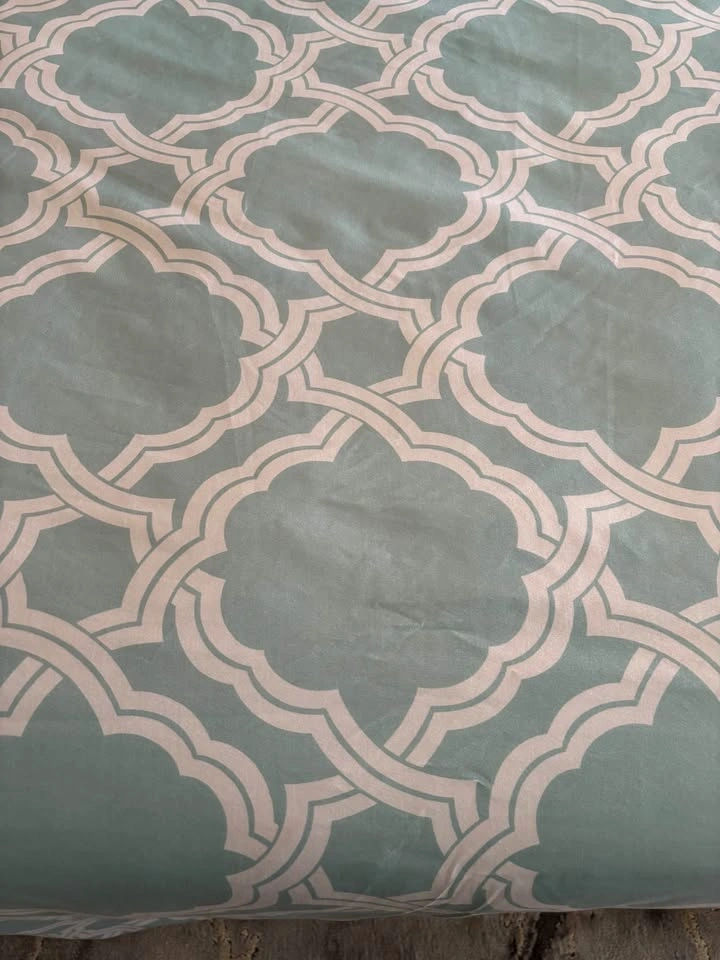 Pretty soft turquoise/white lattice pattern duvet cover/sham, Twin Size. Includes down alternative duvet. Used for staging only, never been slept on. 100% polyester. Cold water wash on gentle cycle. Smoke and pet free home. Keswick Pick Up.