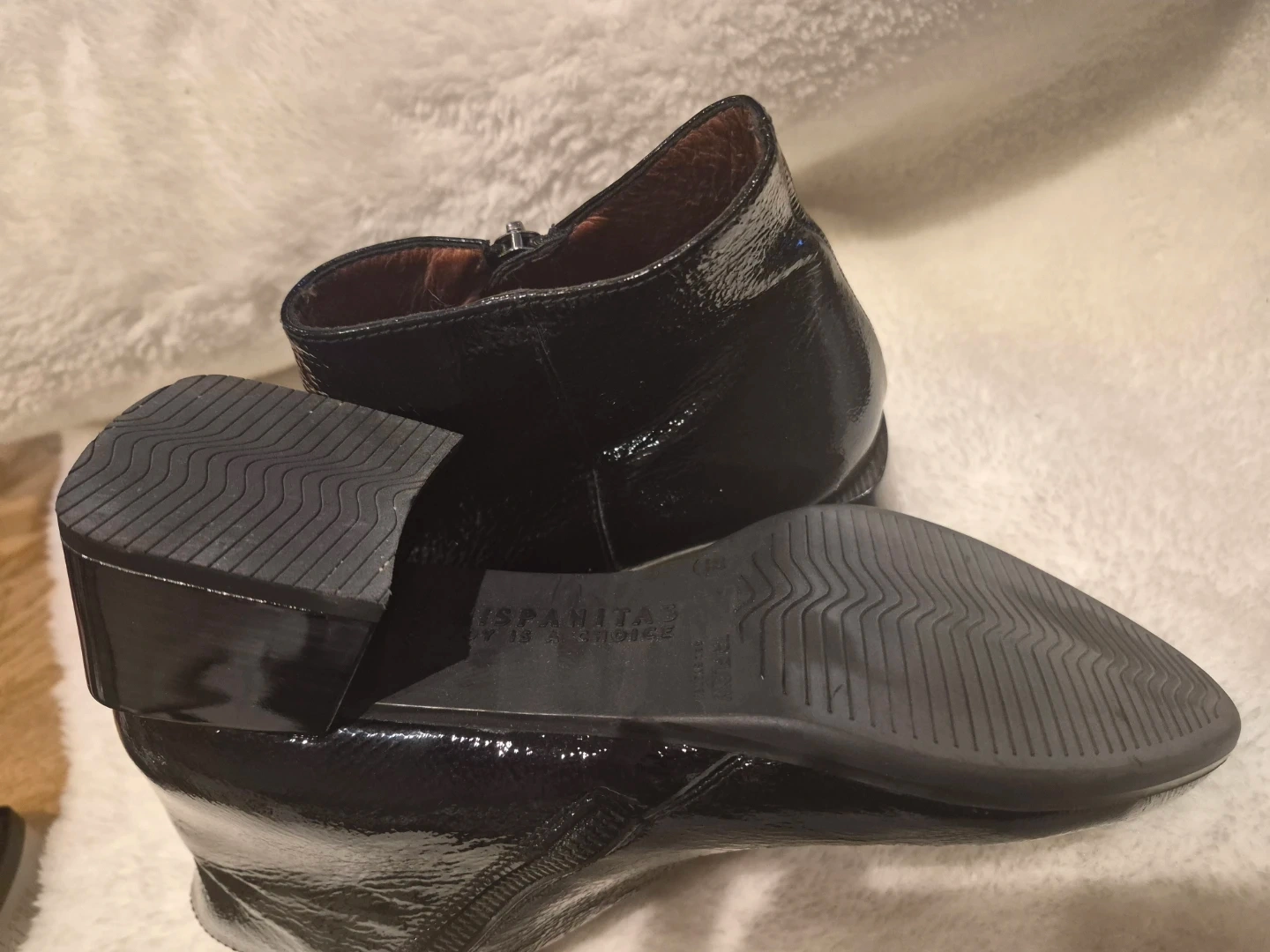 Stylish black patent leather ankle boots with side zippers. Features a block heel and pointed toe. Perfect for dressing up or down!