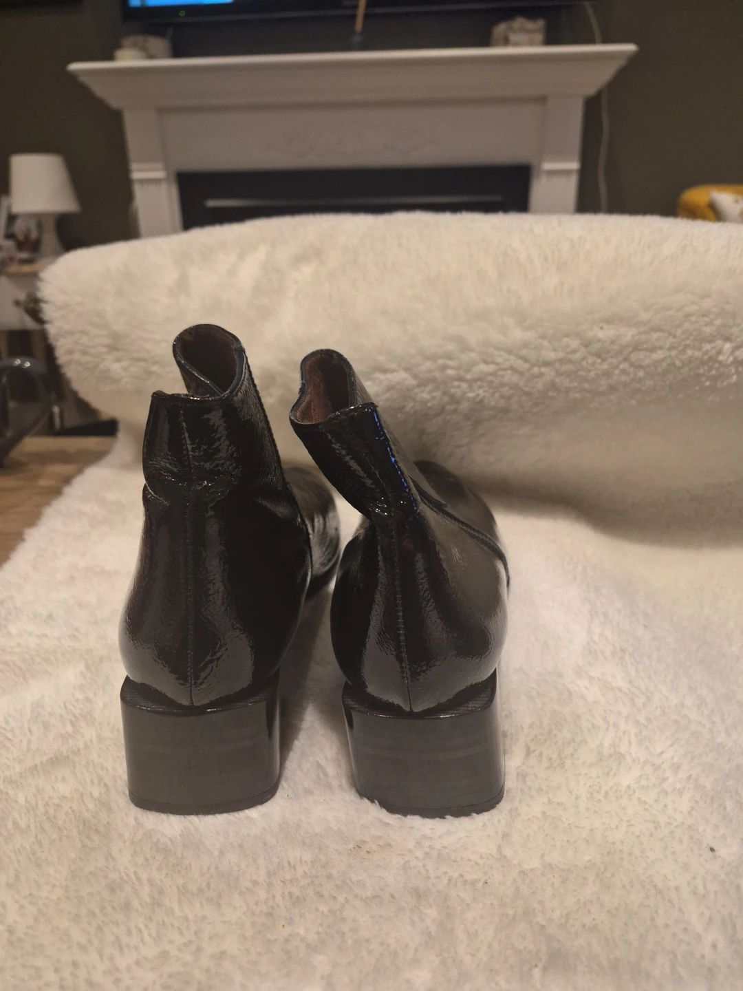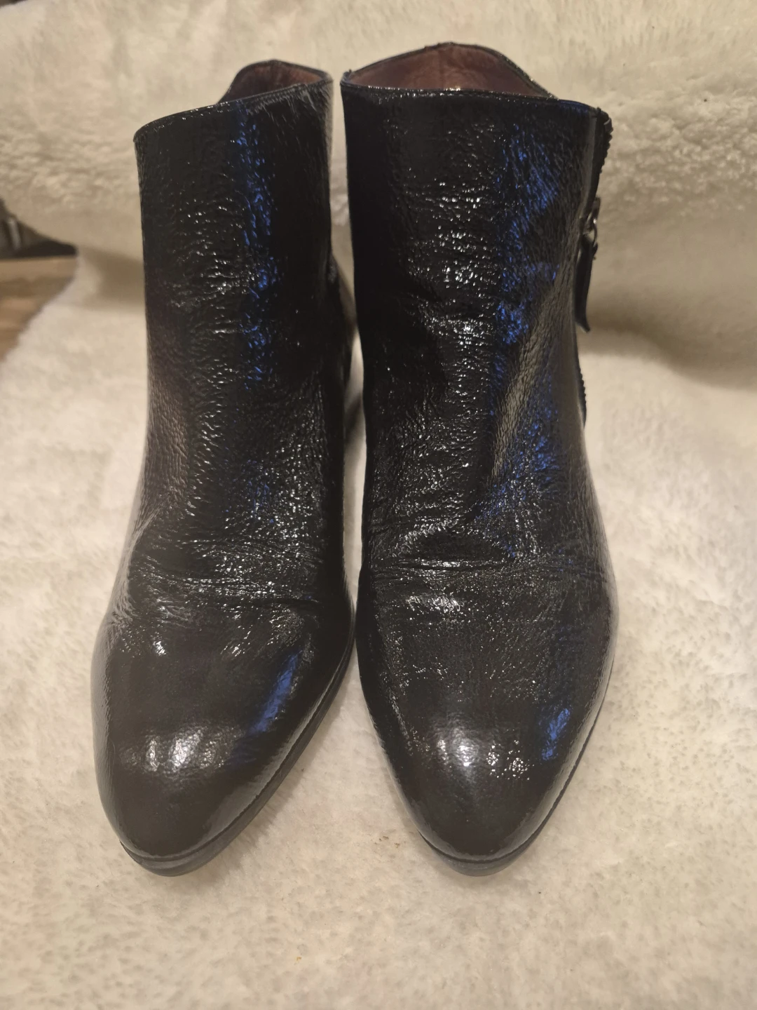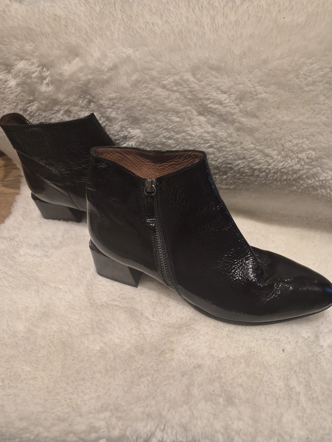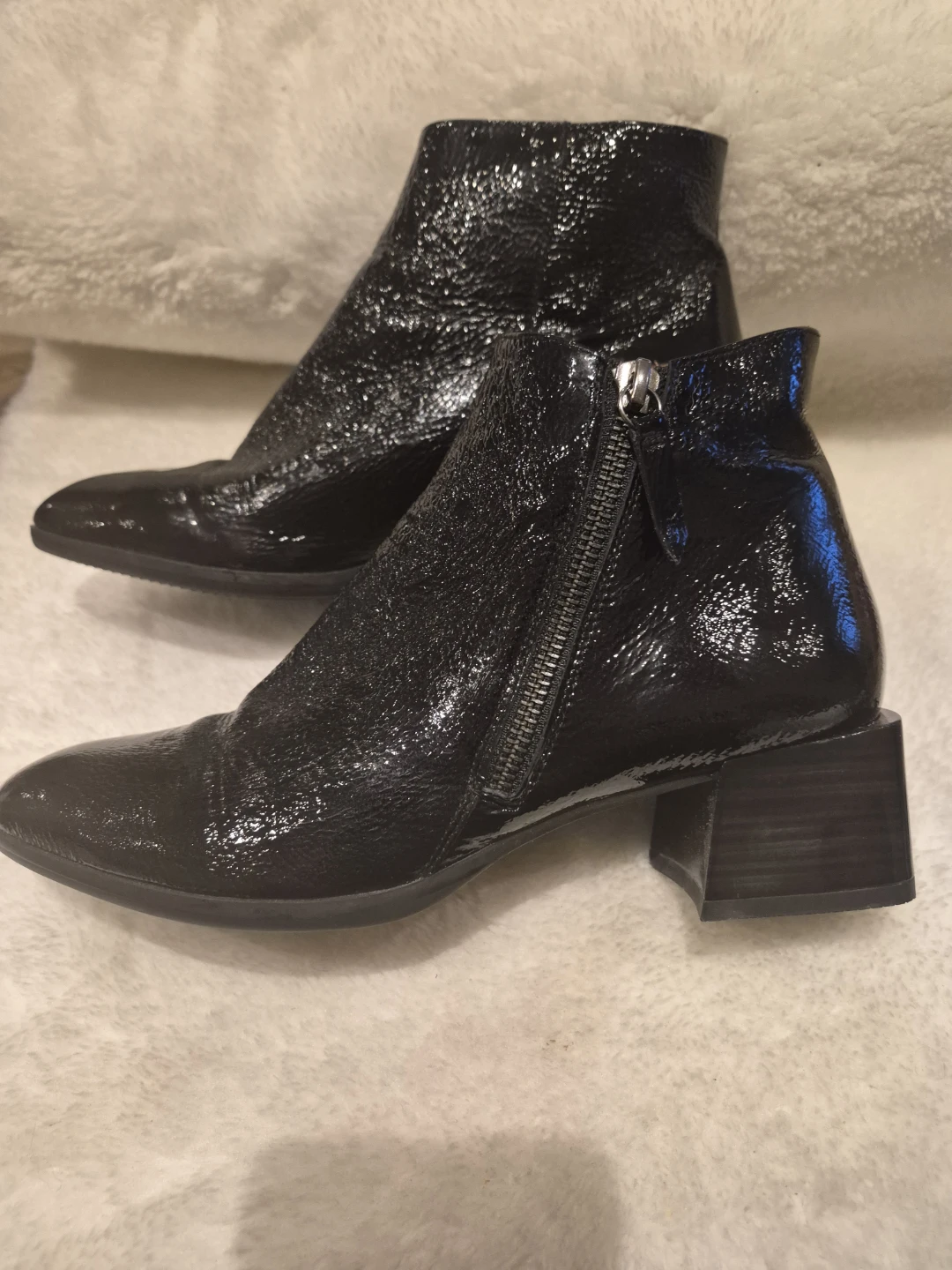 Stylish black patent leather ankle boots with side zippers. Features a block heel and pointed toe. Perfect for dressing up or down!