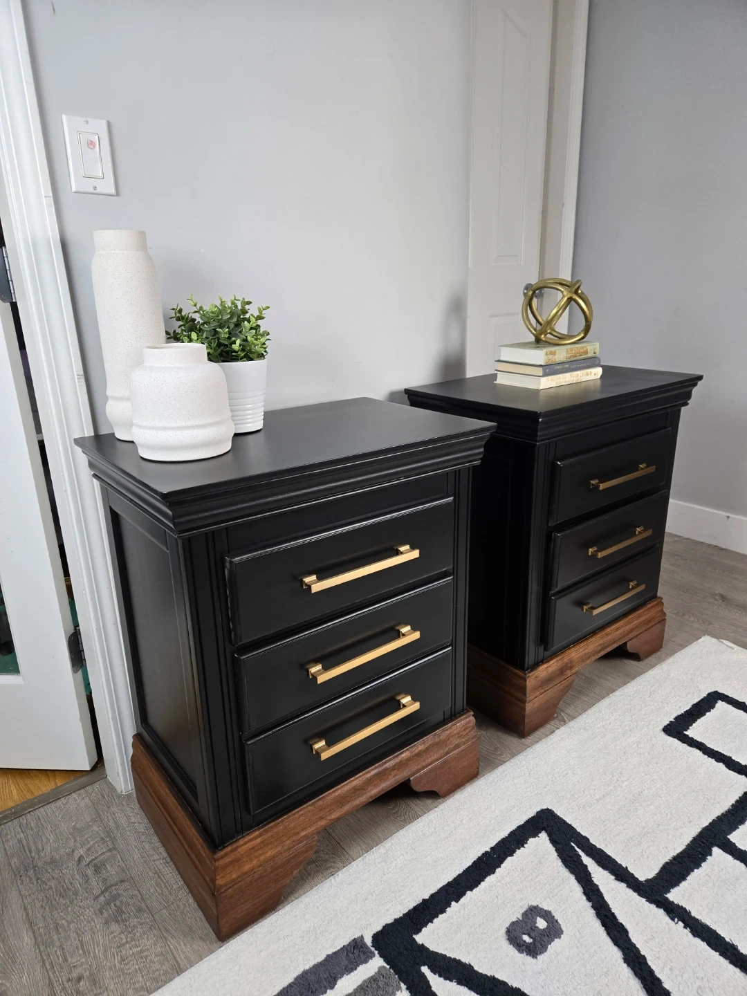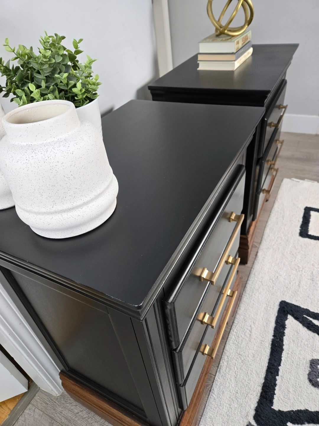 These 2 nightstands have been primed, spray painted and top coated with polyacrylic for durability.