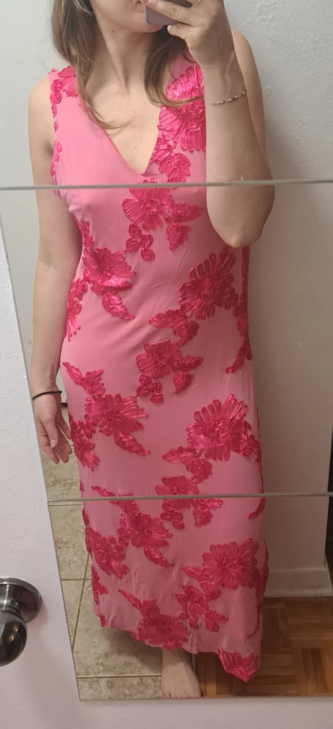 This sleeveless pink maxi dress features a v-neck and all-over floral applique detailing. It's made of a sheer overlay with an opaque lining. Great for special occasions!