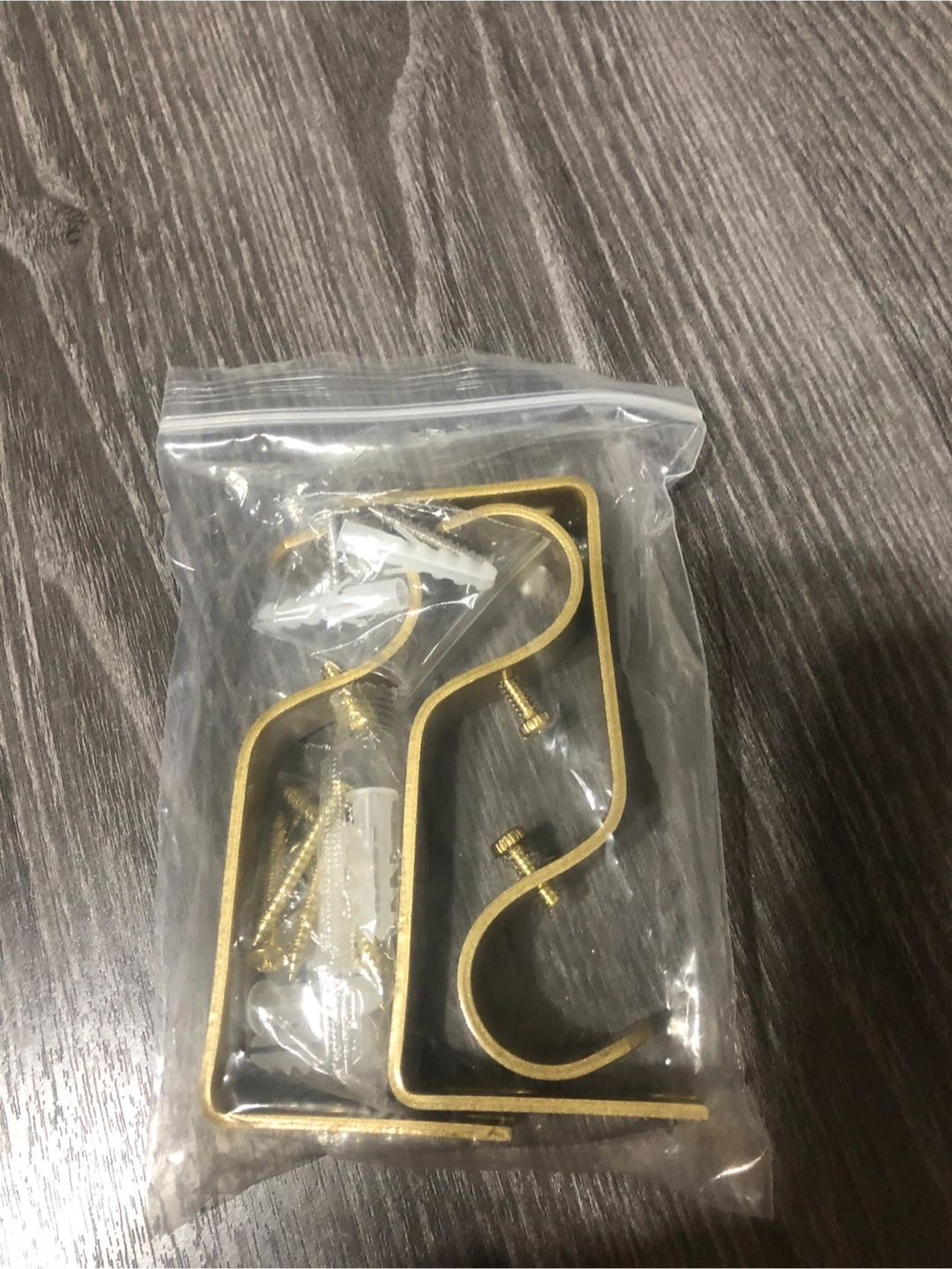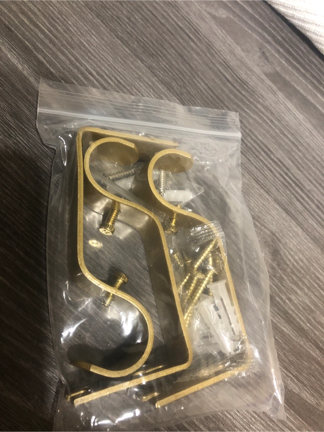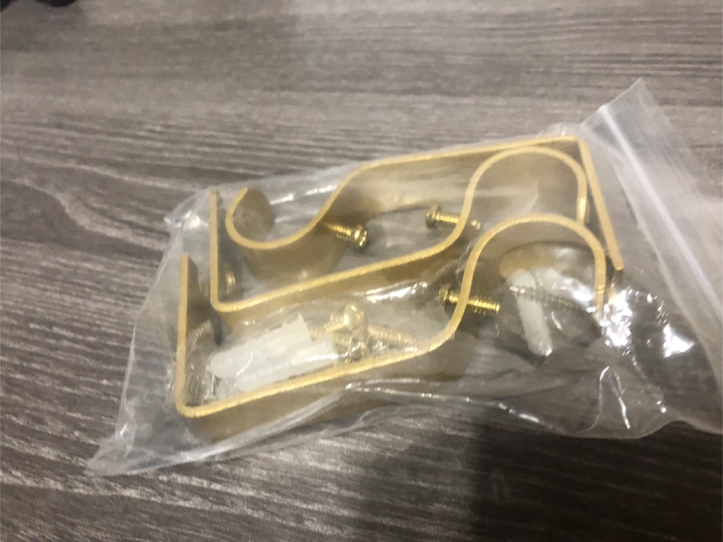 Selling a new set of curtain rod brackets in a gold tone. They appear to be brand new and still in the original packaging. Includes the necessary screws and wall anchors for installation. Perfect for adding a touch of elegance to your window treatments!