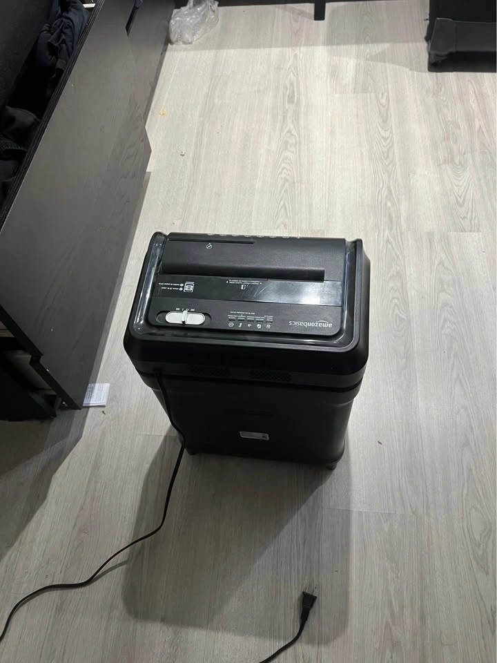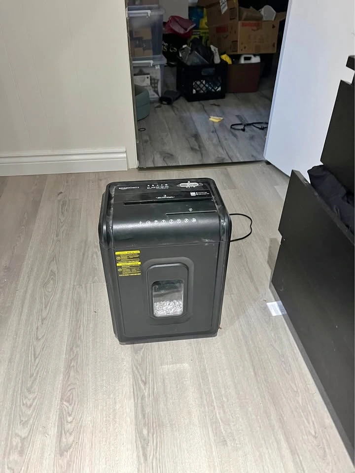 Black AmazonBasics paper shredder handles up to 8 sheets of 20 lb paper at once. It has a dedicated slot for credit cards and a clear window to see when the bin is full. This cross-cut shredder includes a sliding power switch with auto, off, and reverse settings. $35 obo