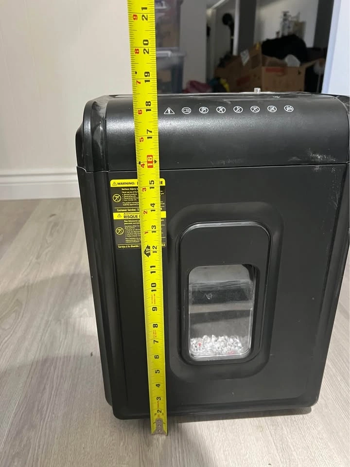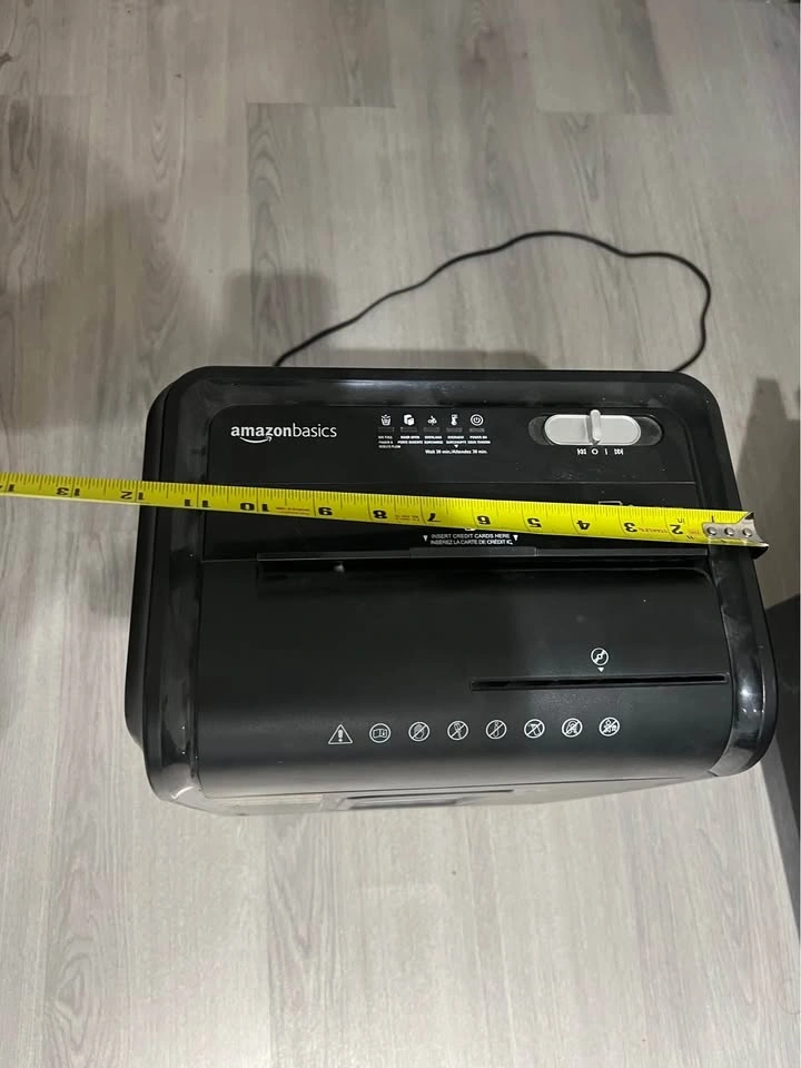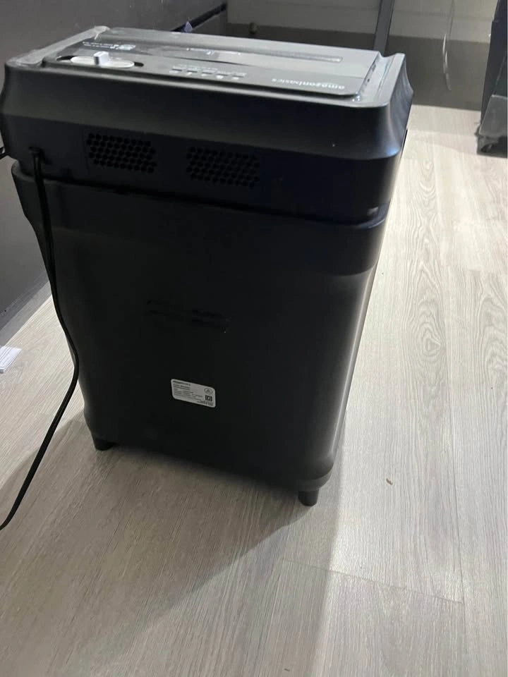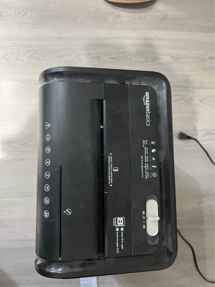 Black AmazonBasics paper shredder handles up to 8 sheets of 20 lb paper at once. It has a dedicated slot for credit cards and a clear window to see when the bin is full. This cross-cut shredder includes a sliding power switch with auto, off, and reverse settings. $35 obo