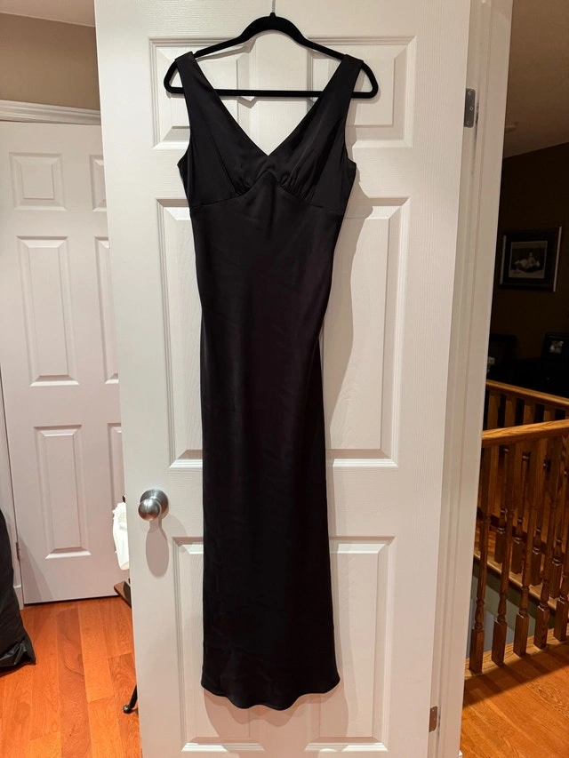 This is an elegant Evernew black dress, perfect for any formal occasion! The dress features a flattering silhouette and is made from a comfortable, flowing fabric. This dress is in excellent condition.
