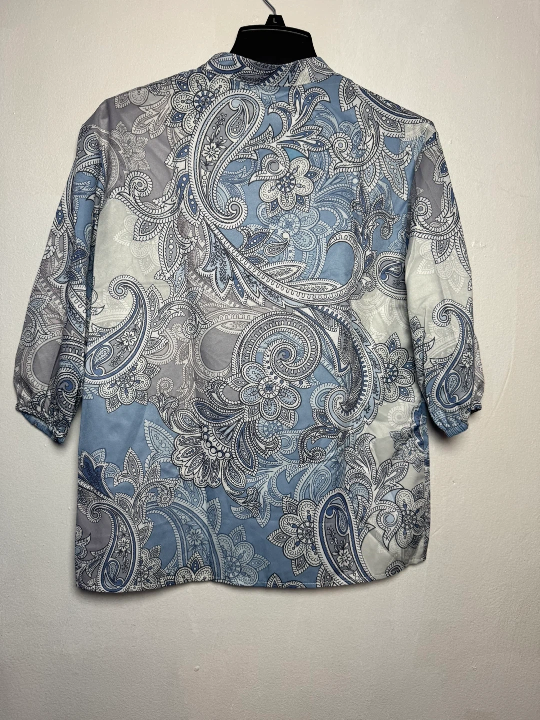 This is a blue and gray paisley print blouse. It's made of 100% polyester. Size is S. Made in China.