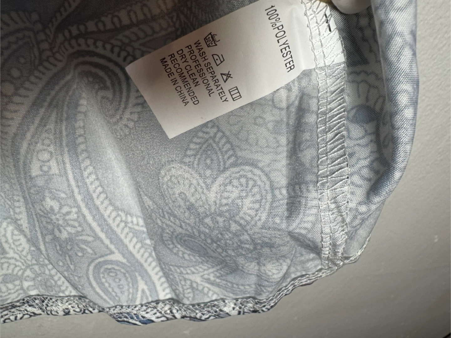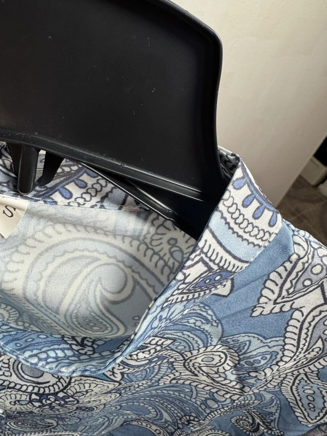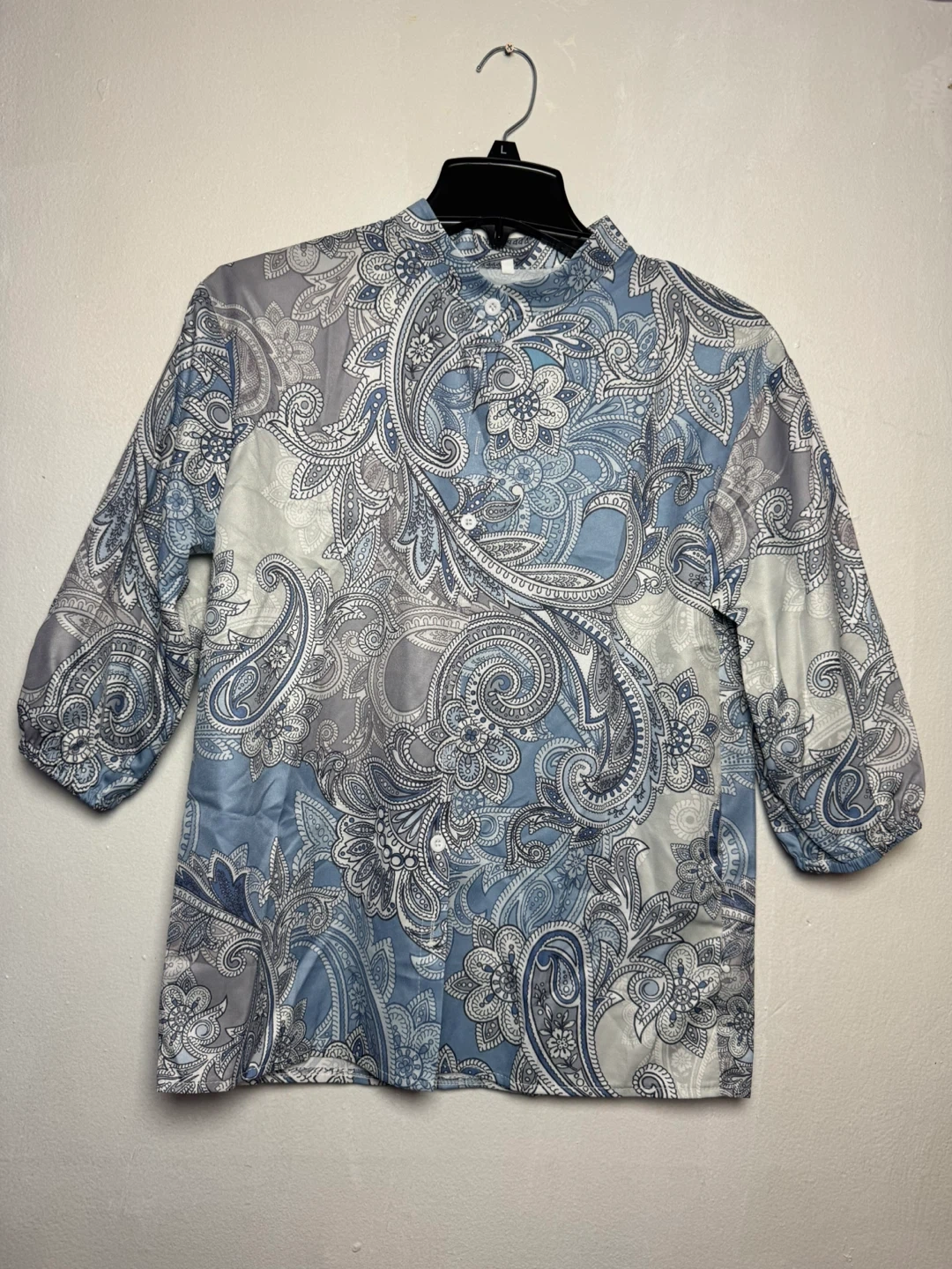 This is a blue and gray paisley print blouse. It's made of 100% polyester. Size is S. Made in China.