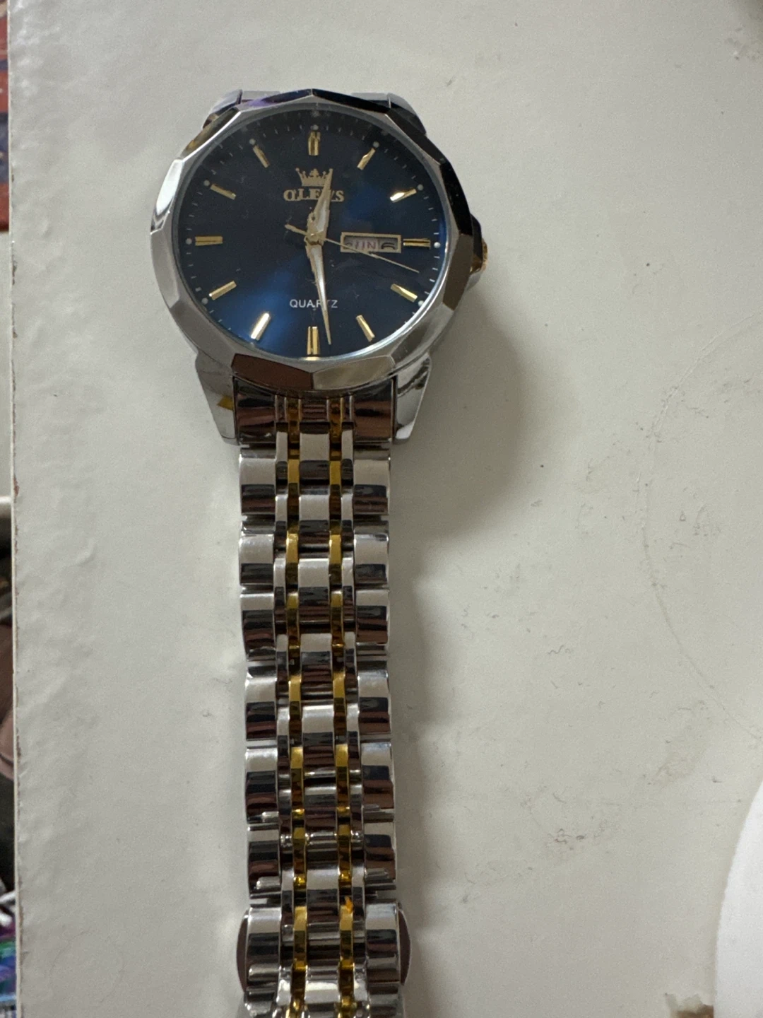 Selling an OLEVS quartz watch with a silver and gold band. It's in good condition and has a stylish look. The watch features a blue face and a quartz movement