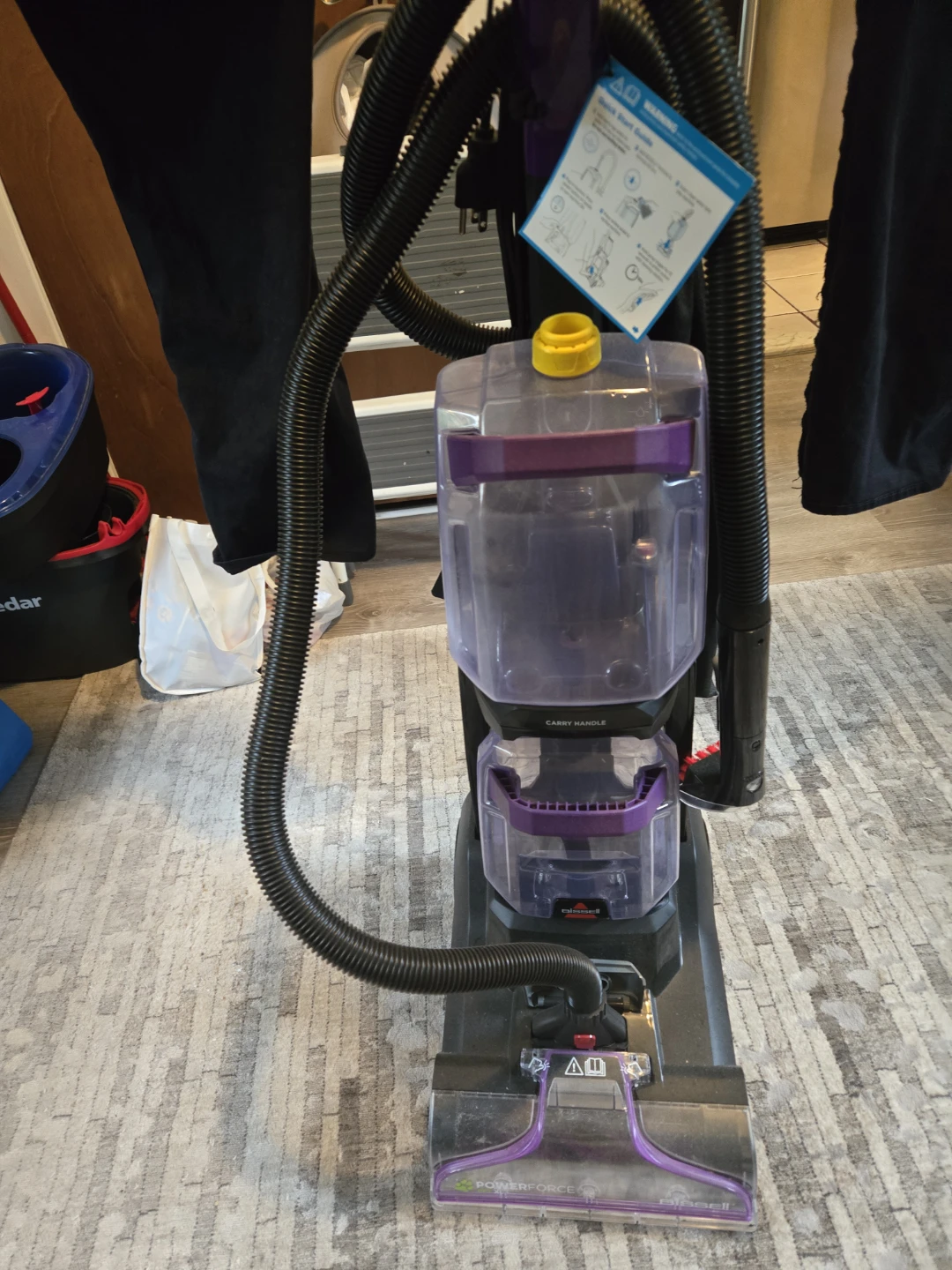 This Bissell carpet cleaner and upholstery cleaner is ready for use. It has a clean water tank and a spray trigger. You'll need to add warm tap water and BISSELL formula.used only once.