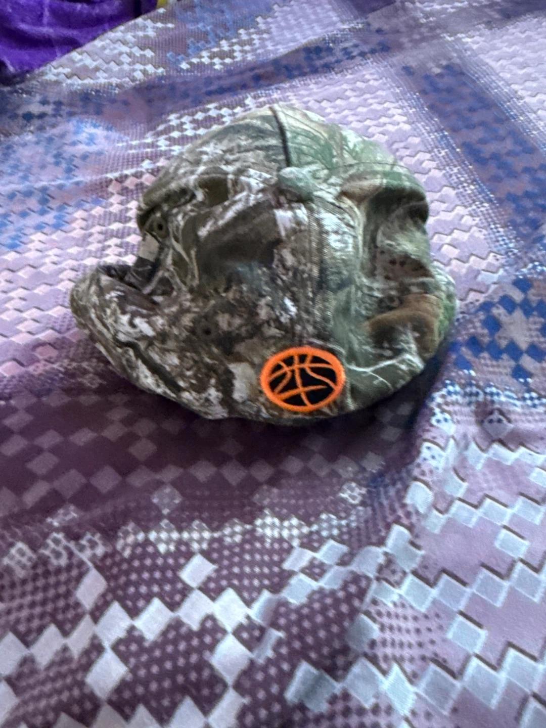 This is a camouflage baseball cap with embroidered patches. It features a bear logo on the front and a basketball logo on the side. This hat's design is great for outdoor activities or casual wear.