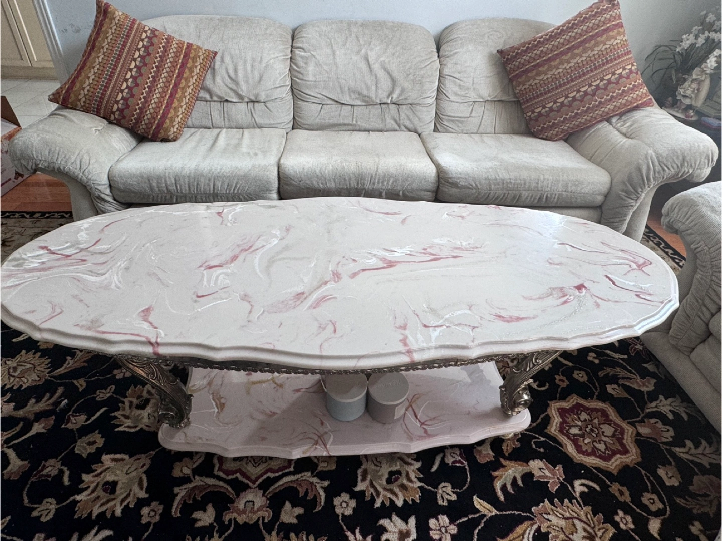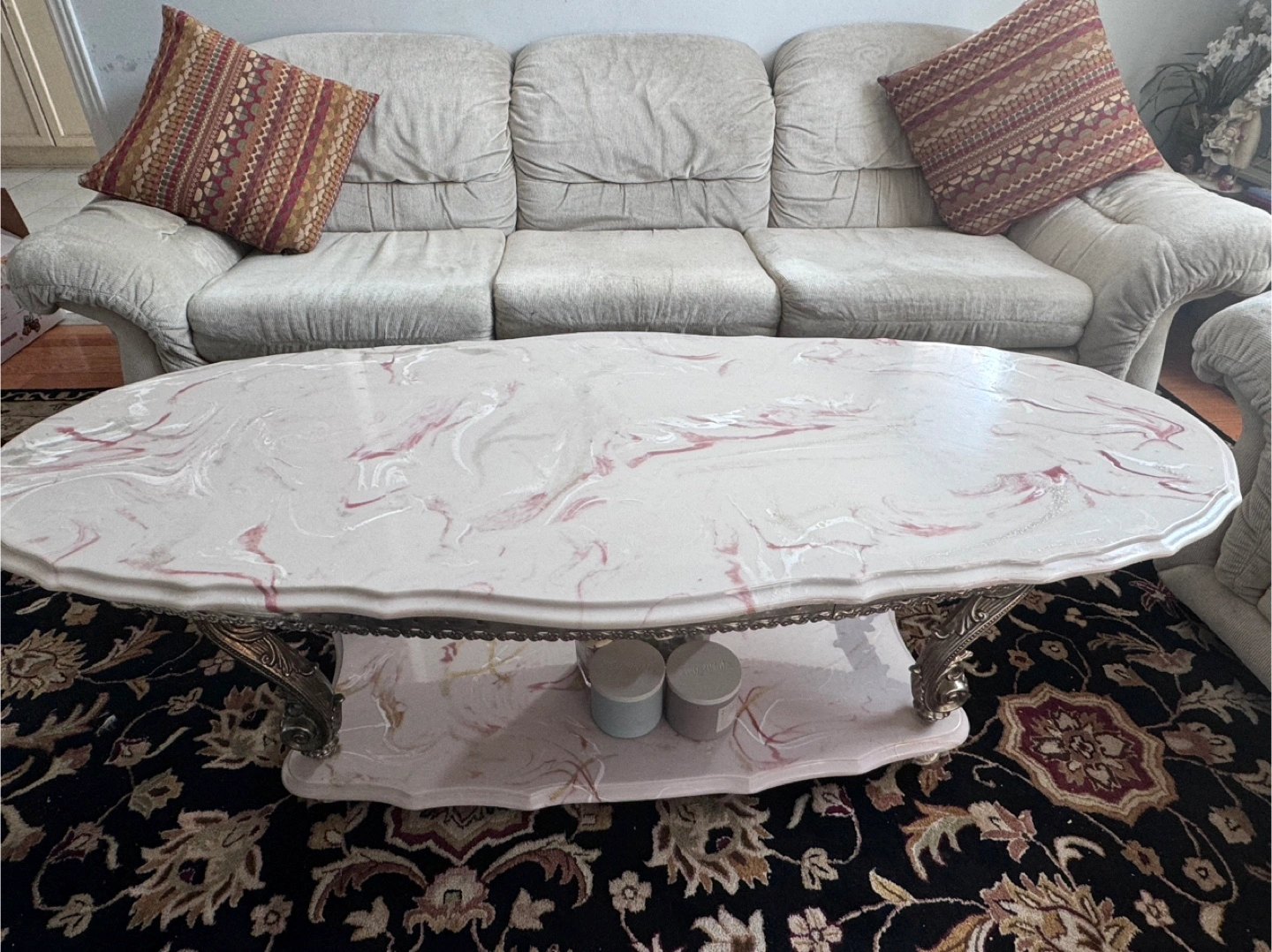 Unique oval-shaped coffee table. Features a beautiful marble-look top and a lower shelf for storage. Elegant design with ornate silver-coloured legs. Perfect for a living room or family room.