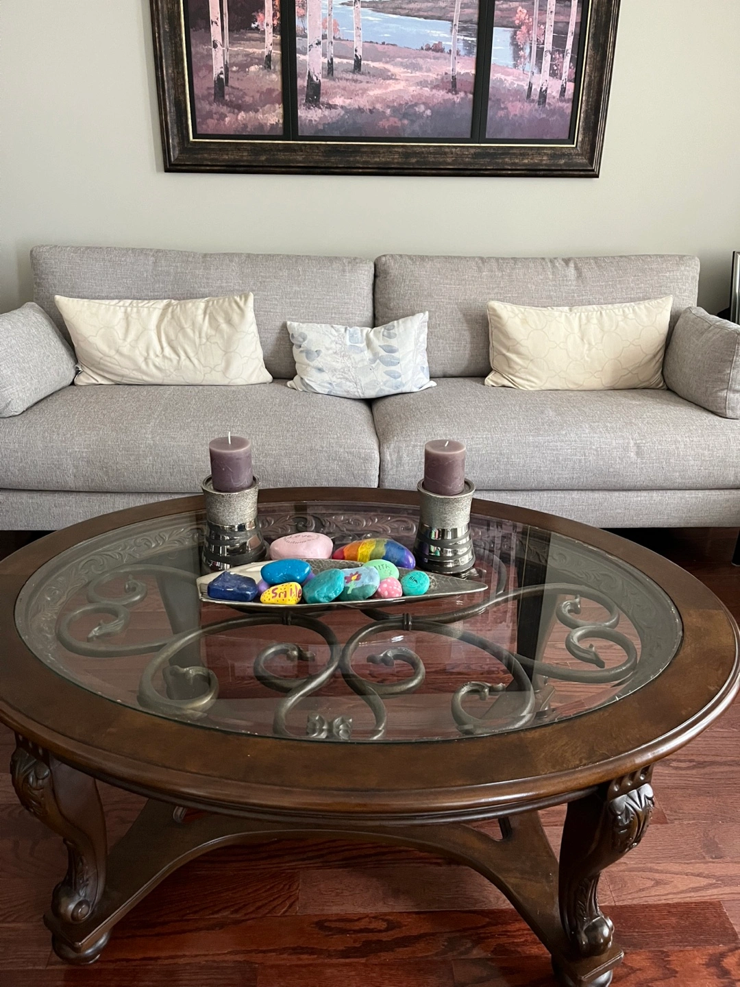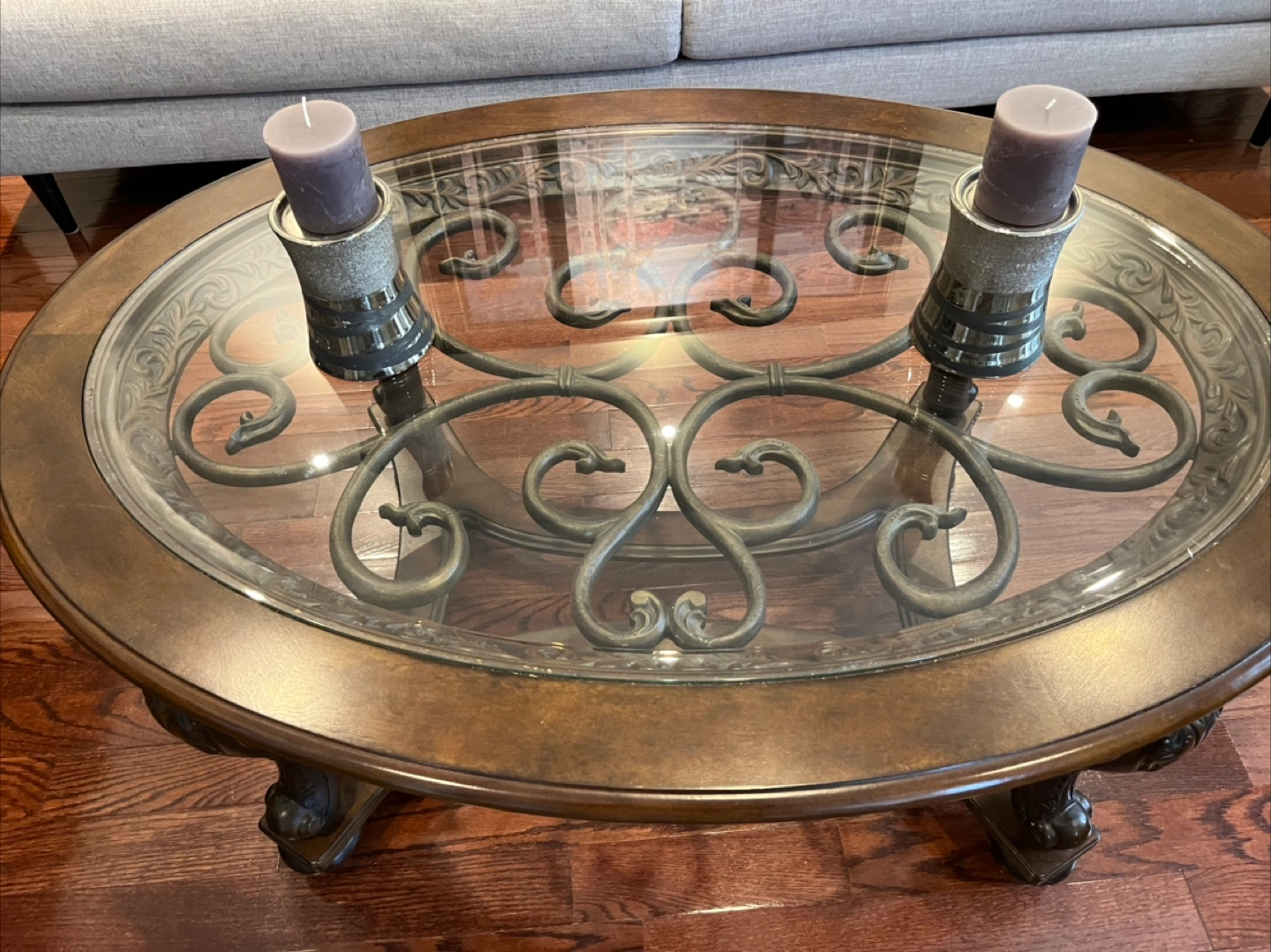 10Selling a Beautiful oval coffee table with glass top. Bought from Ashley furniture. Features an ornate, dark brown wooden frame and legs. Glass top with decorative metal accents. Elegant design, perfect for a living room.
