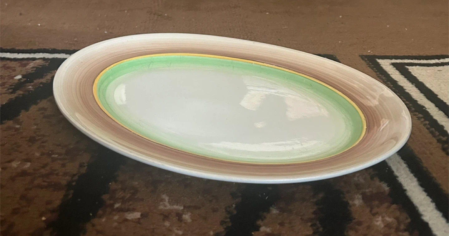 Selling a lovely oval serving platter with a unique green and brown design around the rim. It's perfect for serving appetizers or desserts at your next gathering. It's in great shape and ready for a new home!