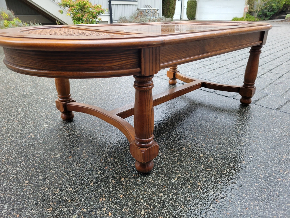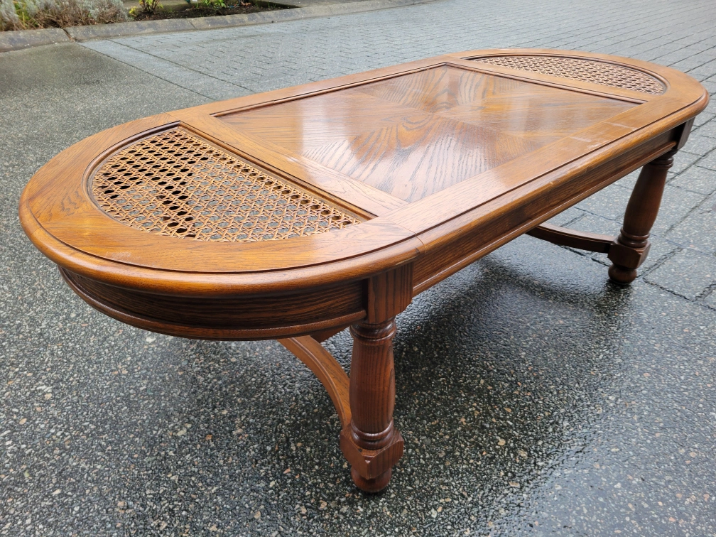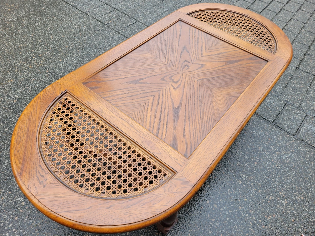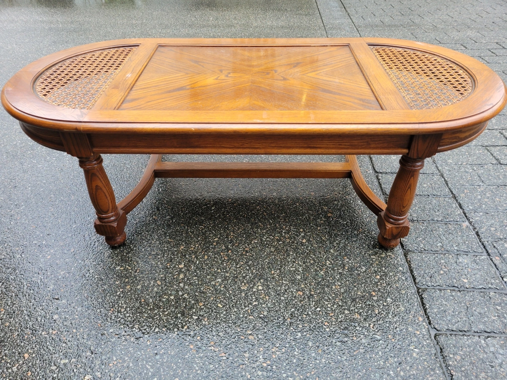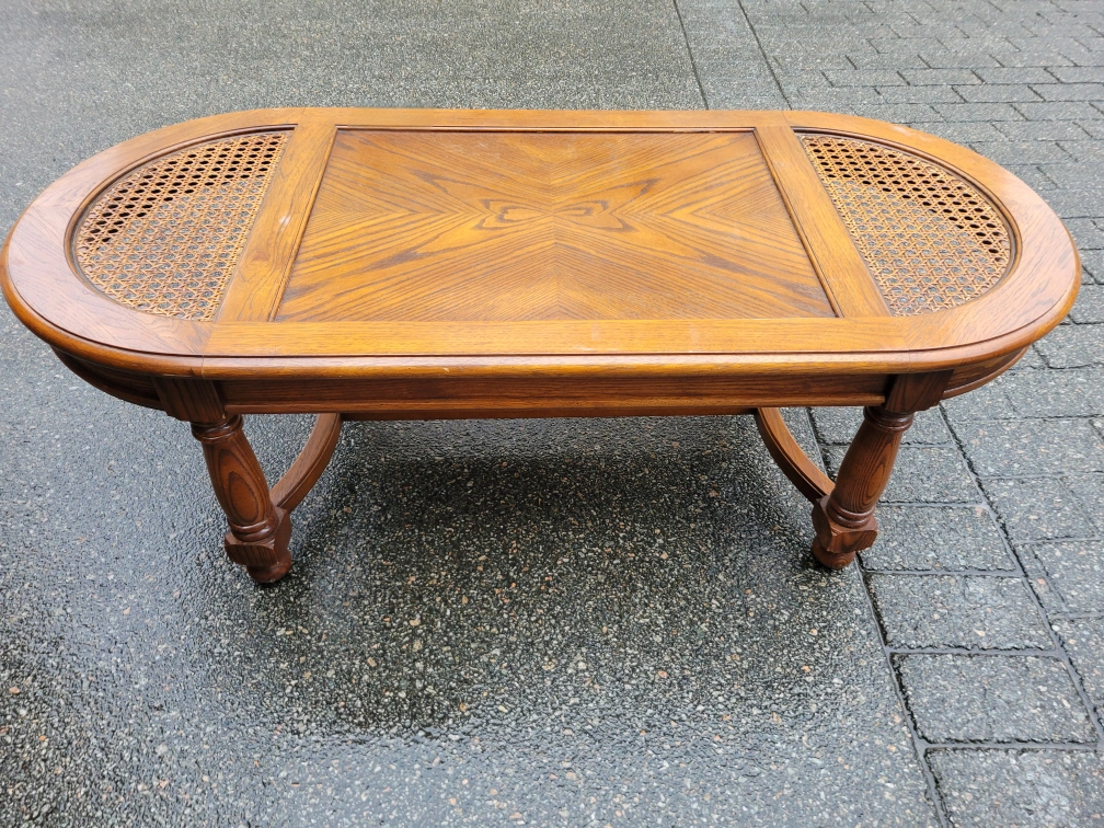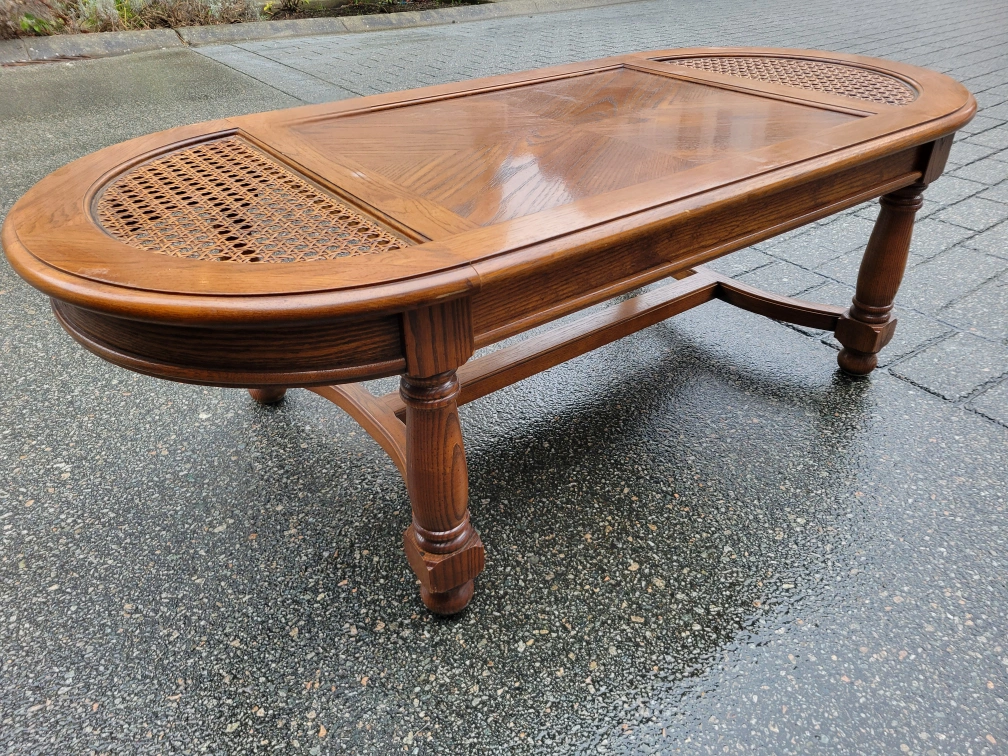 103Unique oval-shaped coffee table. Features a wood top with cane inserts on either side. Turned legs. Solid wood construction. Great addition to your living room. Beautiful design. measurements are 52" wide X 24" deep X 16" tall. Let me know if you're interested. Thanks.