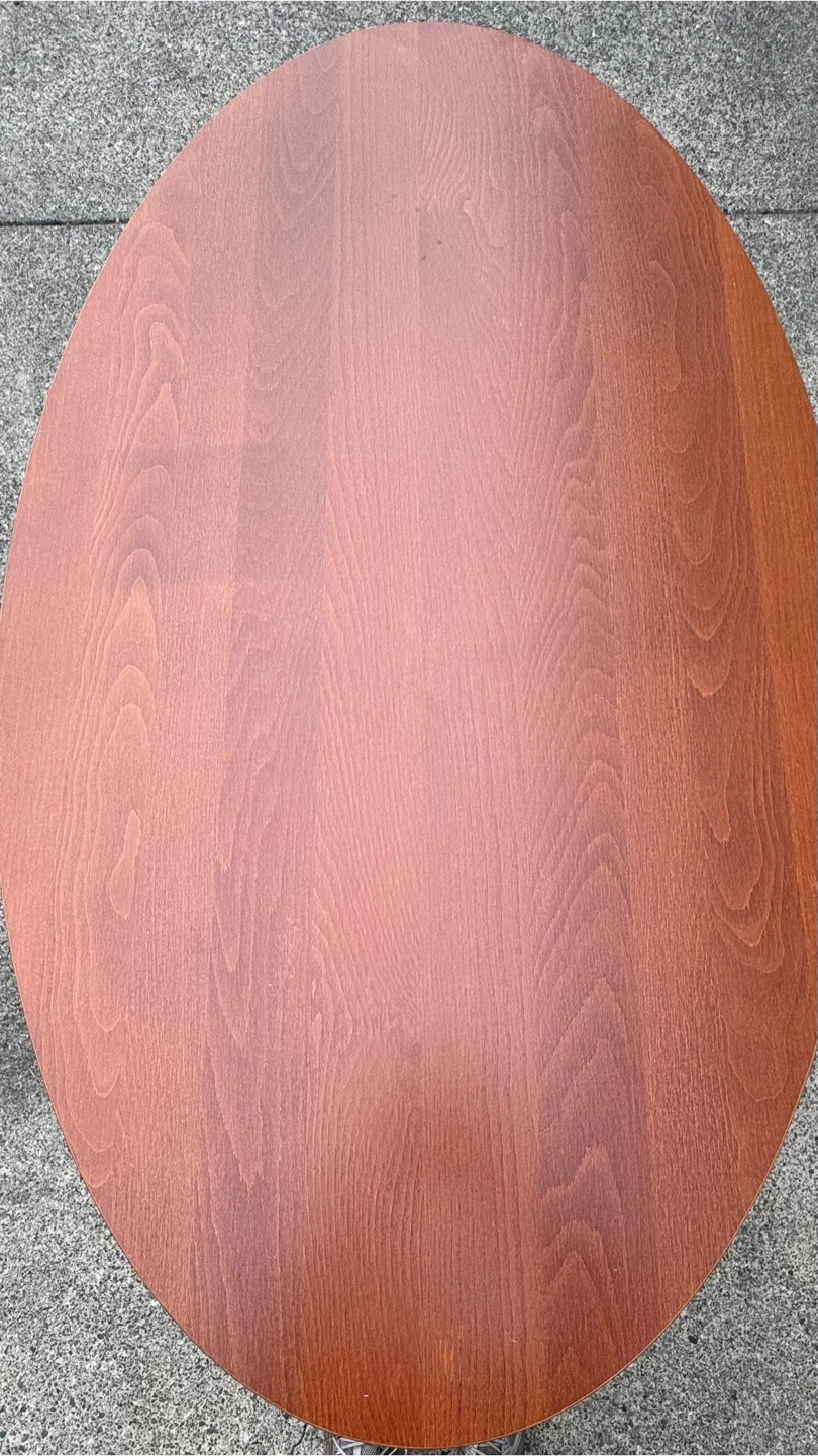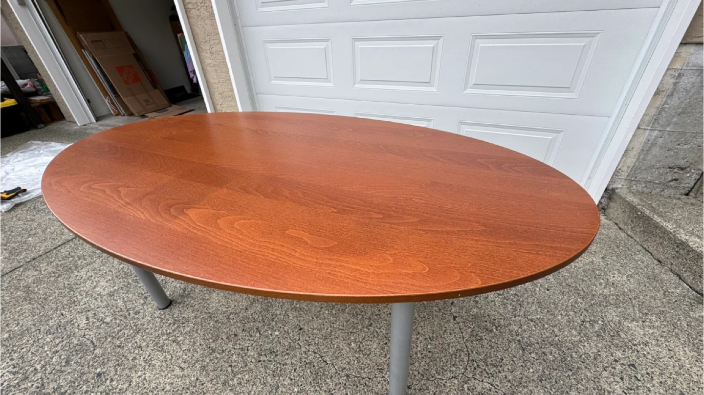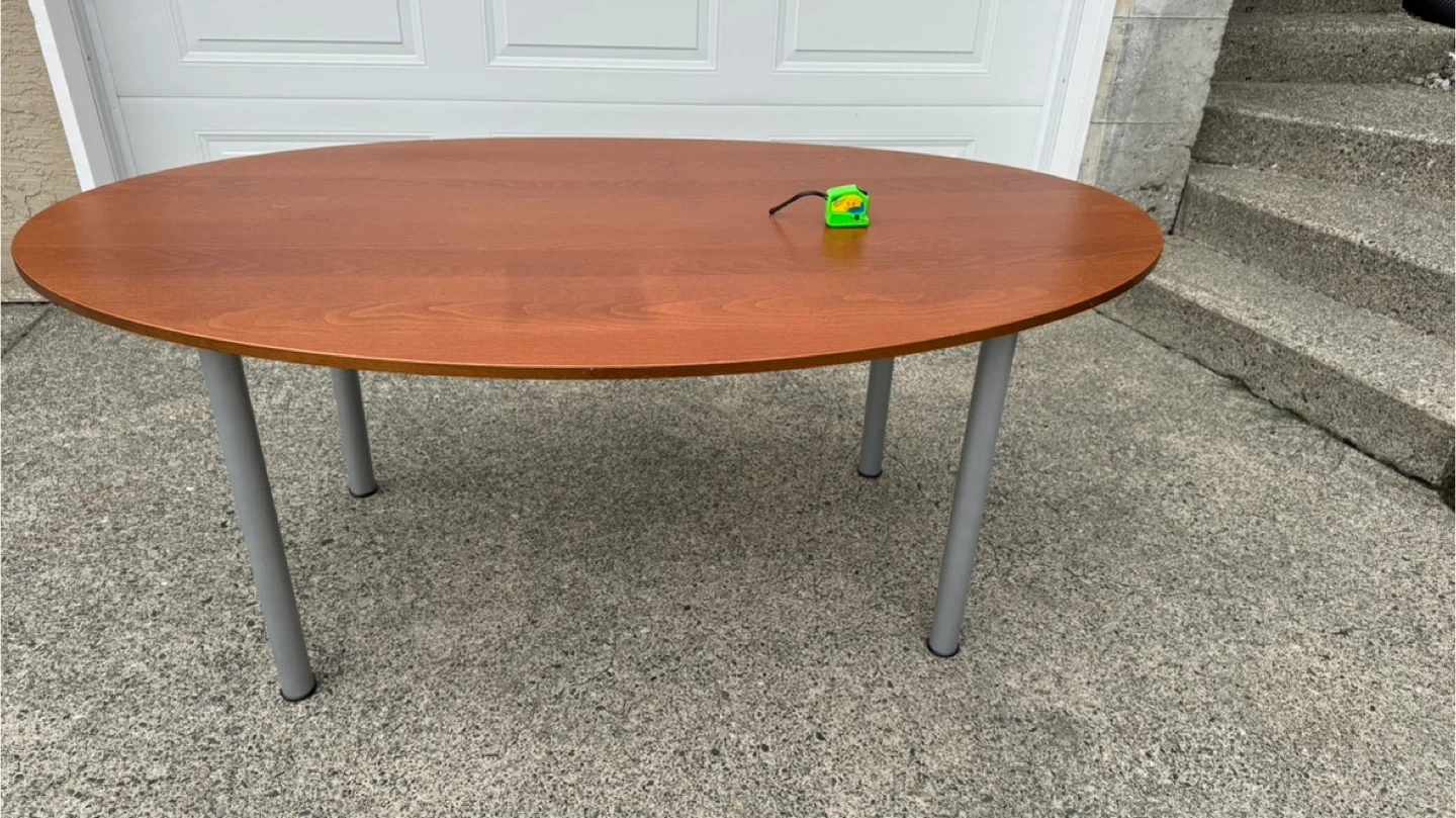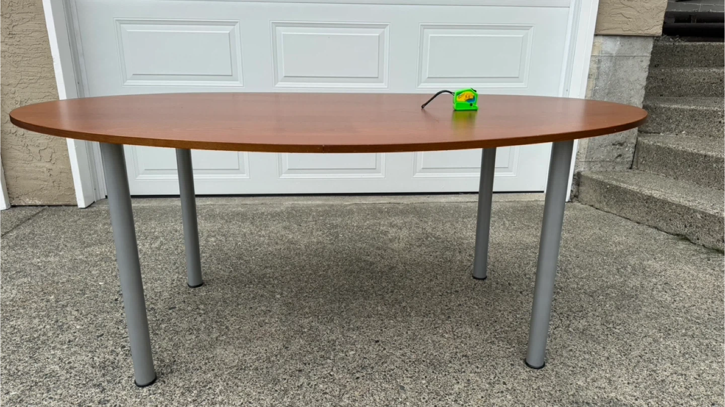58Here's a nice oval-shaped wooden table with silver legs. It's in good condition and would be a great addition to any home or office space. Approximately 39” x 71” inches. Buyer responsible for pickup. Please ensure your vehicle can accommodate.