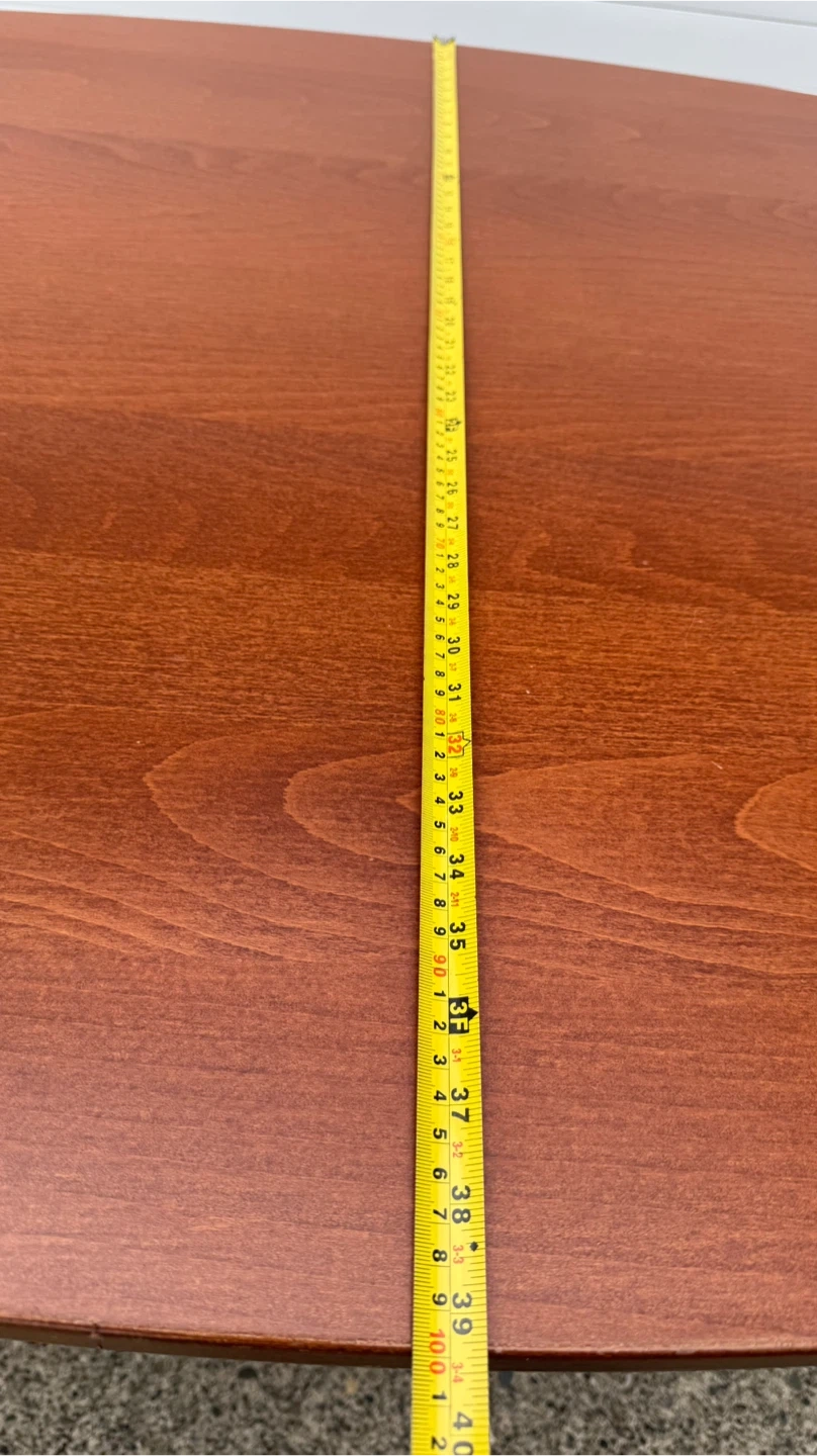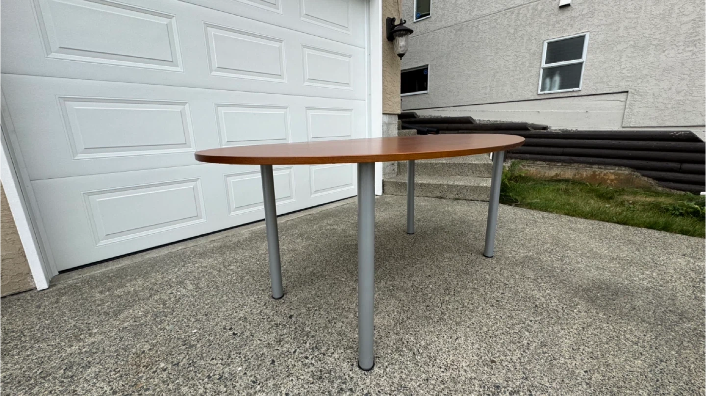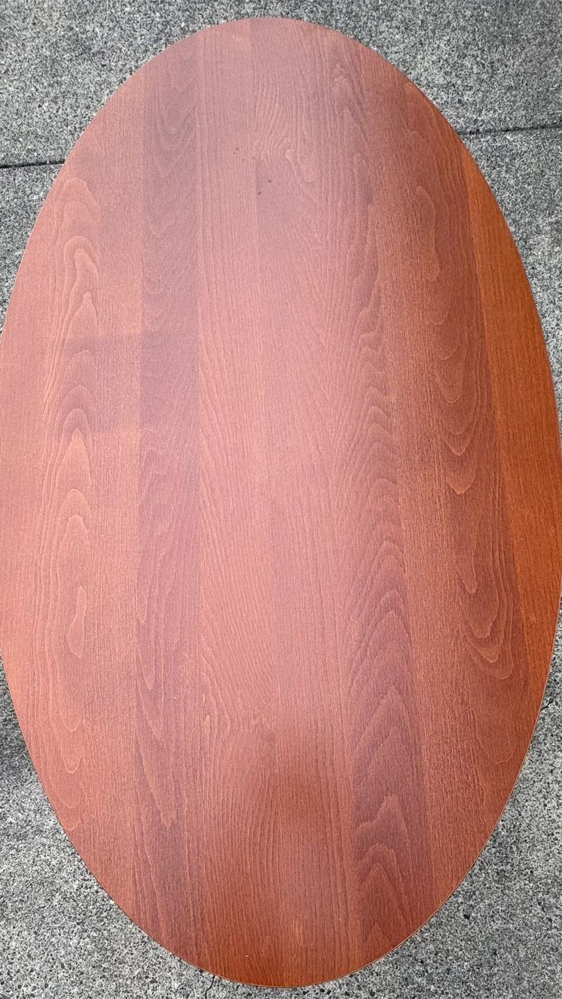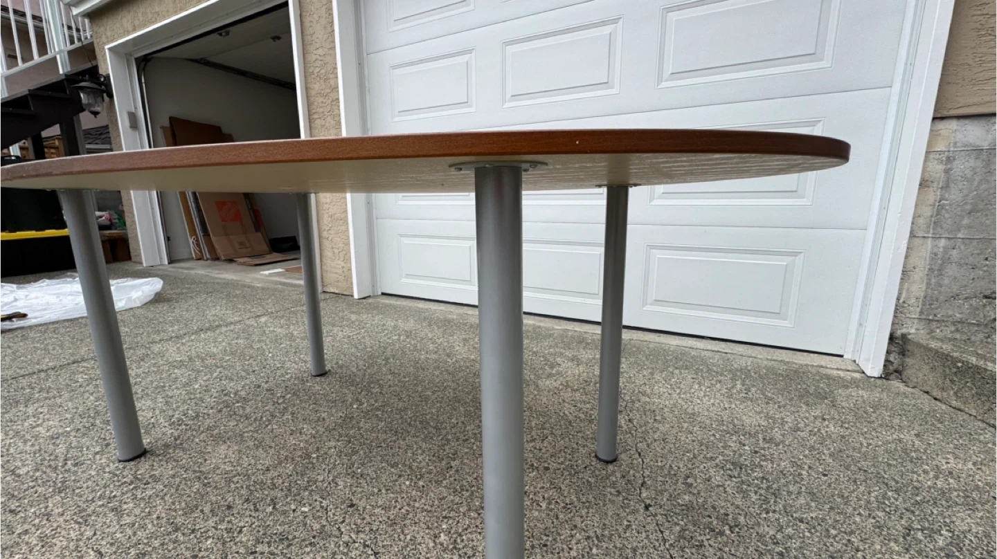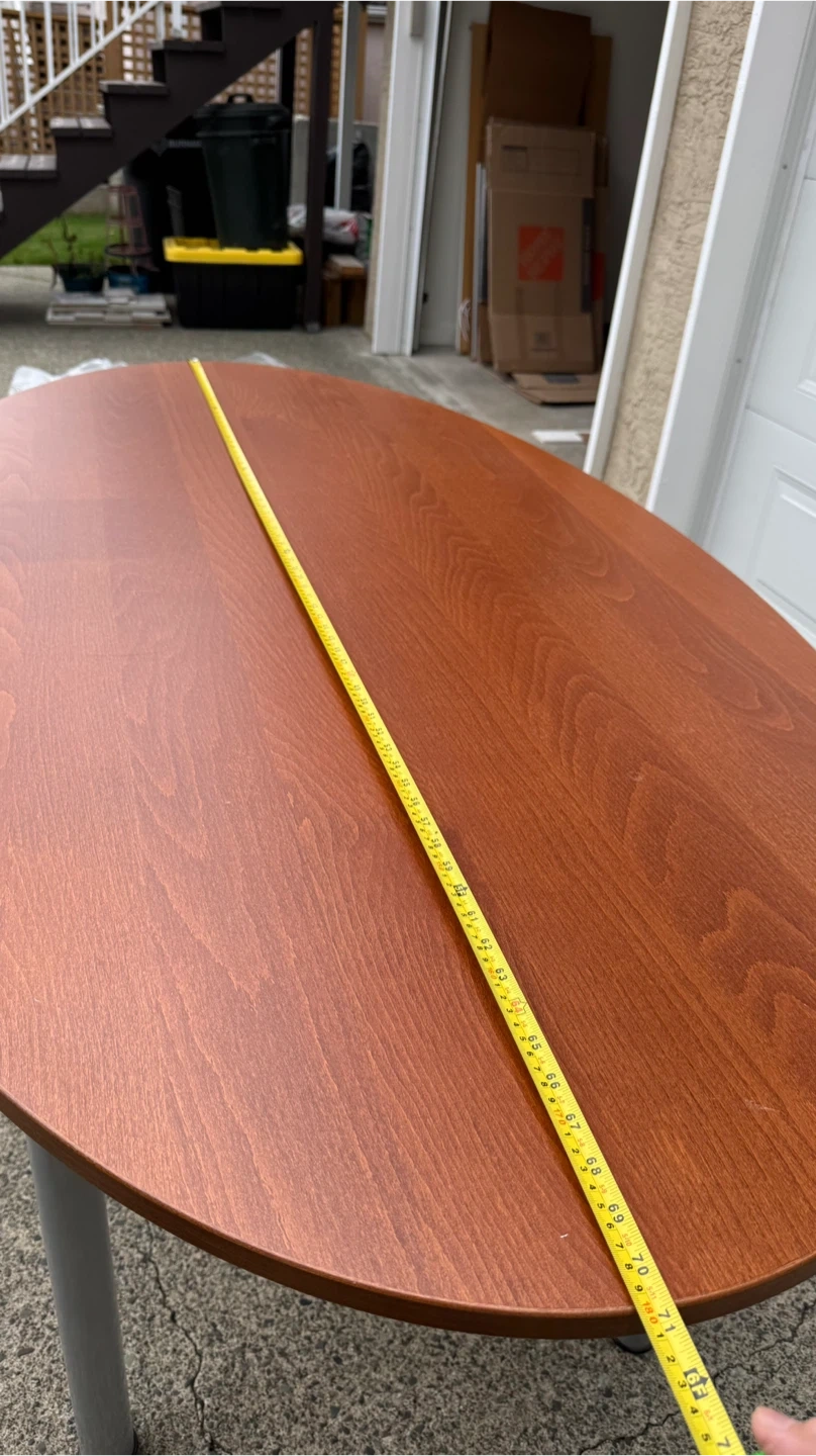 58Here's a nice oval-shaped wooden table with silver legs. It's in good condition and would be a great addition to any home or office space. Approximately 39” x 71” inches. Buyer responsible for pickup. Please ensure your vehicle can accommodate.