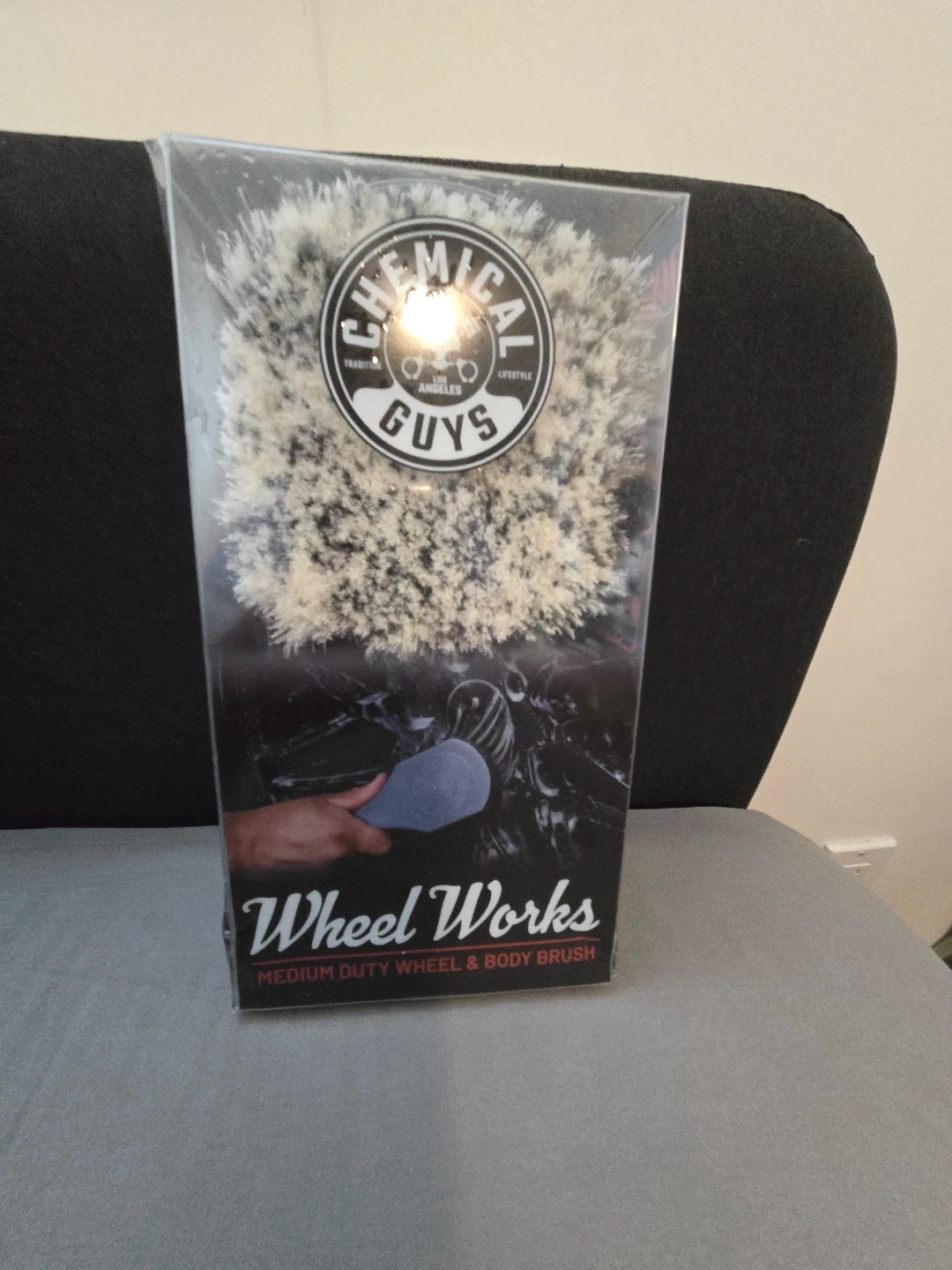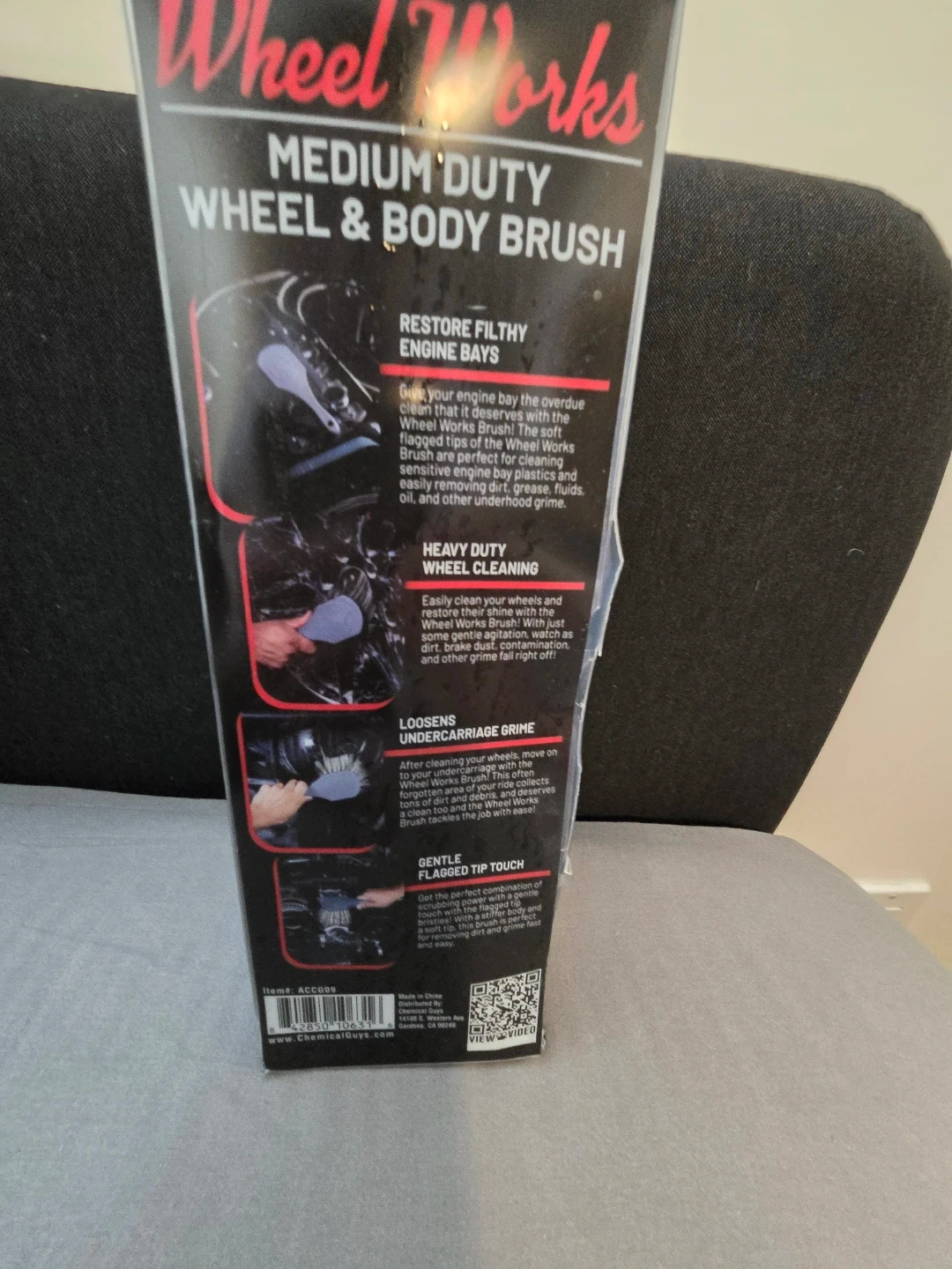 This is a Chemical Guys Wheel Works Medium Duty Wheel & Body Brush. It's designed for cleaning wheels and engine bays. The soft flagged bristles make it safe for various surfaces.