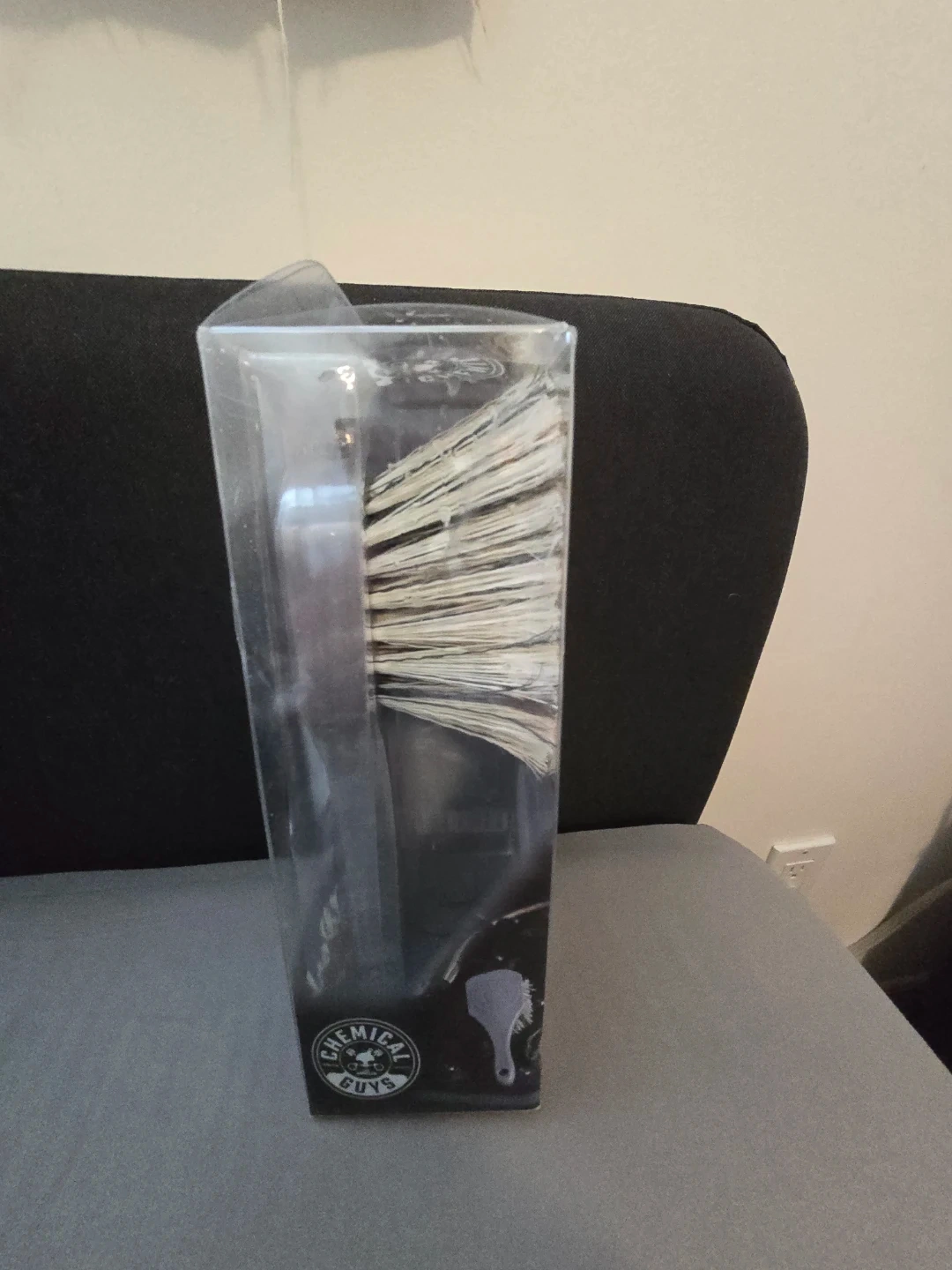 This is a Chemical Guys Wheel Works Medium Duty Wheel & Body Brush. It's designed for cleaning wheels and engine bays. The soft flagged bristles make it safe for various surfaces.