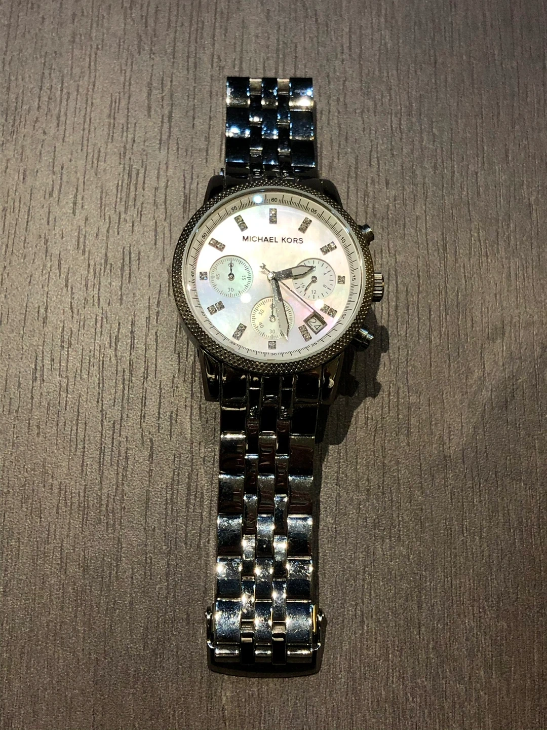 This Michael Kors chronograph watch features a silver-tone stainless steel band and a mother-of-pearl dial. It's water-resistant up to 5 ATM and includes extra links for band adjustment. The watch comes with its original box and receipt.
