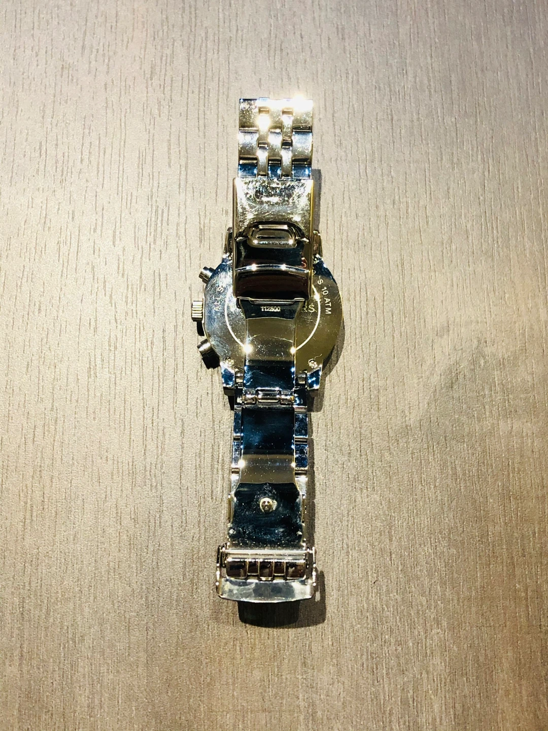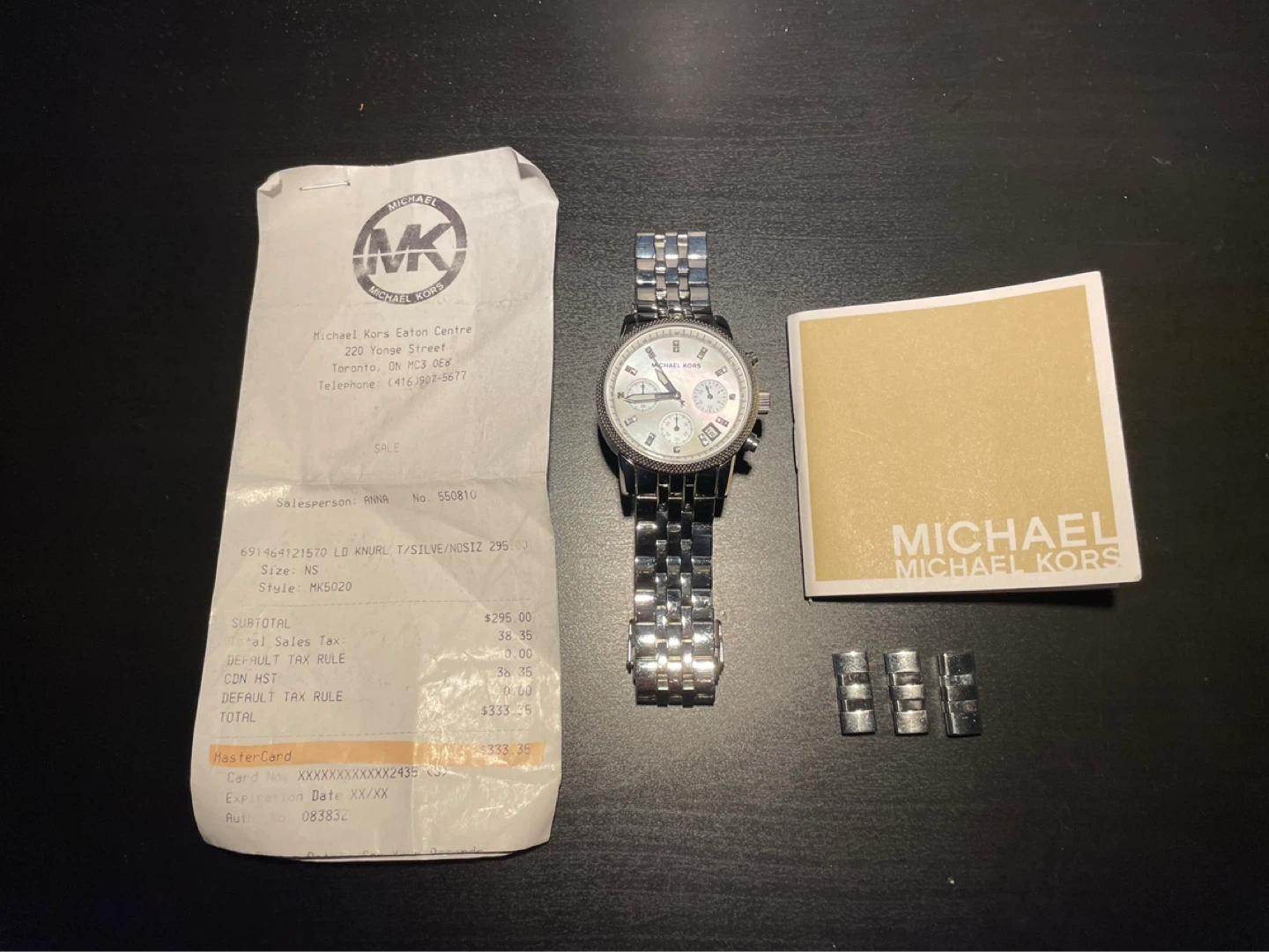 This Michael Kors chronograph watch features a silver-tone stainless steel band and a mother-of-pearl dial. It's water-resistant up to 5 ATM and includes extra links for band adjustment. The watch comes with its original box and receipt.