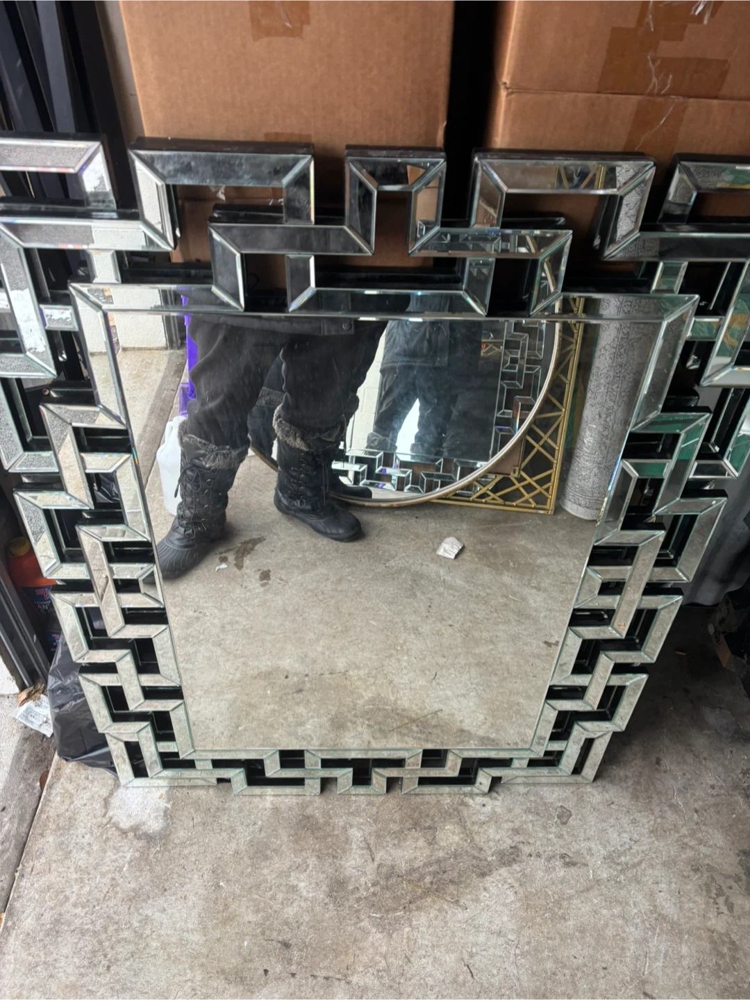 Selling a decorative wall mirror. It has a unique geometric design around the edges. It's in good condition and ready to brighten up your space!
